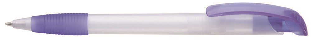 Druckkugelschreiber mit transparent gefrostetem Gehäuse, Gummigriffzone und Bogenclipdrücker.