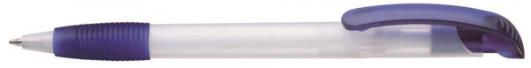 Druckkugelschreiber mit transparent gefrostetem Gehäuse, Gummigriffzone und Bogenclipdrücker.