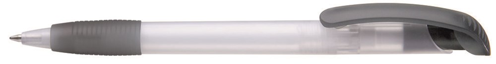 Druckkugelschreiber mit transparent gefrostetem Gehäuse, Gummigriffzone und Bogenclipdrücker.