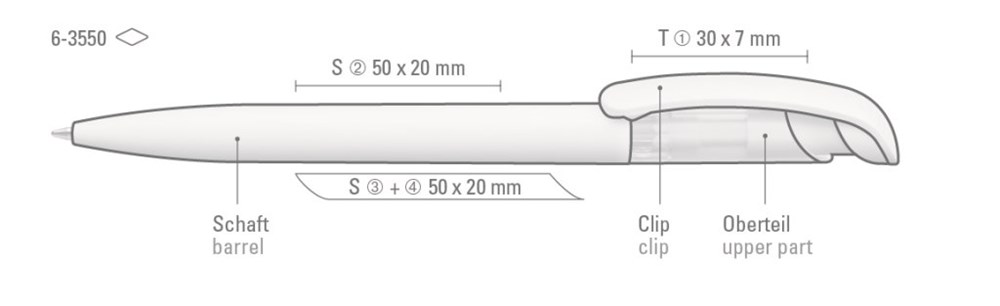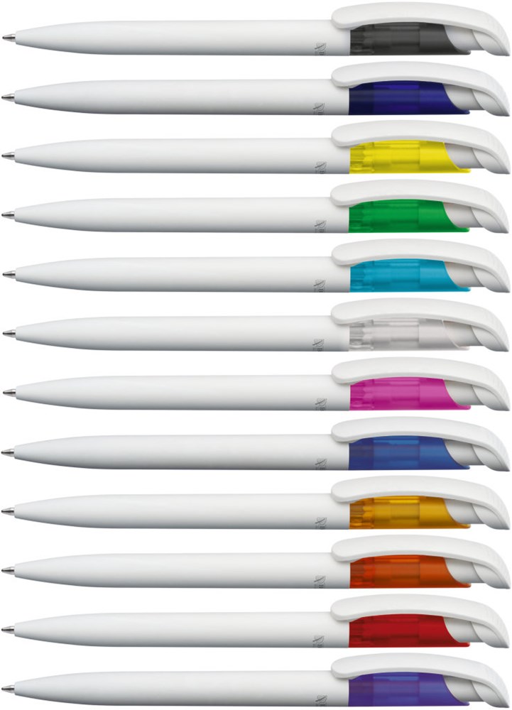 Druckkugelschreiber mit Schaftunterteil und Clip aus 100% nachwachsendem und kompostierbarem Werkstoff. Schaftoberteil aus gefrostetem ABS Kunststoff in verschiedenen Farben. Minentype: uma Jumbo Refill Minenfarbe: blau