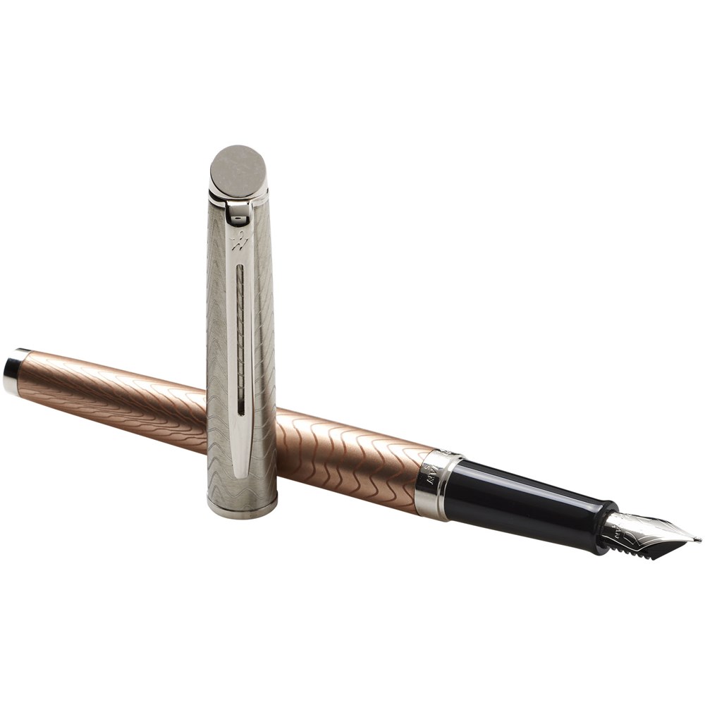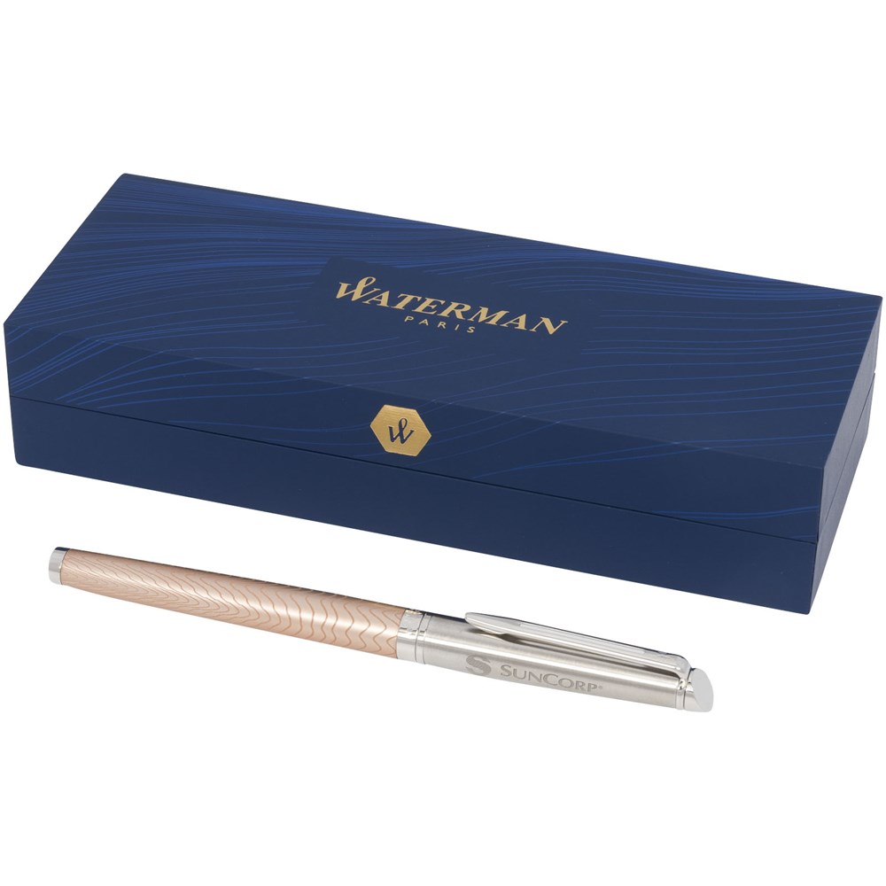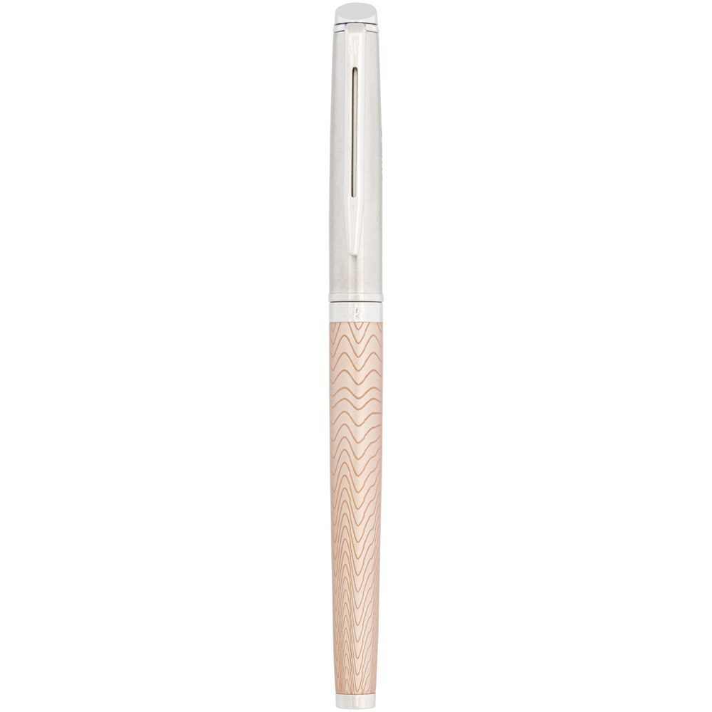Die neue Hémisphère Premium-Kollektion mit fließenden Lasermustern, die die wunderschöne Form der Stifte respektieren und Trends wie natürliche/organische Elemente aufgreifen. Erhältlich als Kugelschreiber, Rollerball-Stift und Füllfederhalter und in 3 Farben/Designs: Eine lebhaft blaue Lackoberfläche komplett mit aufwendigem Signaturmuster eingeätzt in die Kappe, raffinierter Rose-Oberfläche mit subtil eingeätztem Muster und einem unvorhersehbarem und aufwendigem Muster mit palladium-plattierten Verzierungen. Verpackt in einem Waterman-Geschenkkarton.