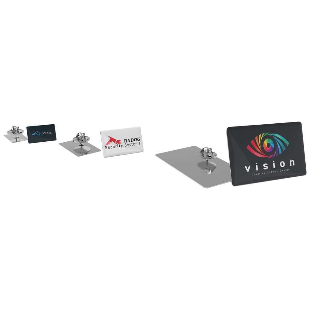 Der Pin Slim ist ein glänzender Metallpin, der mit einem luxuriösen Doming versehen ist. Diese Pins sind in 4 verschiedenen Formen erhältlich: oval, rechteckig, rund und quadratisch. An dem Metallrücken des Pins befindet sich ein Dorn mit Schmetterlingsverschluss.
