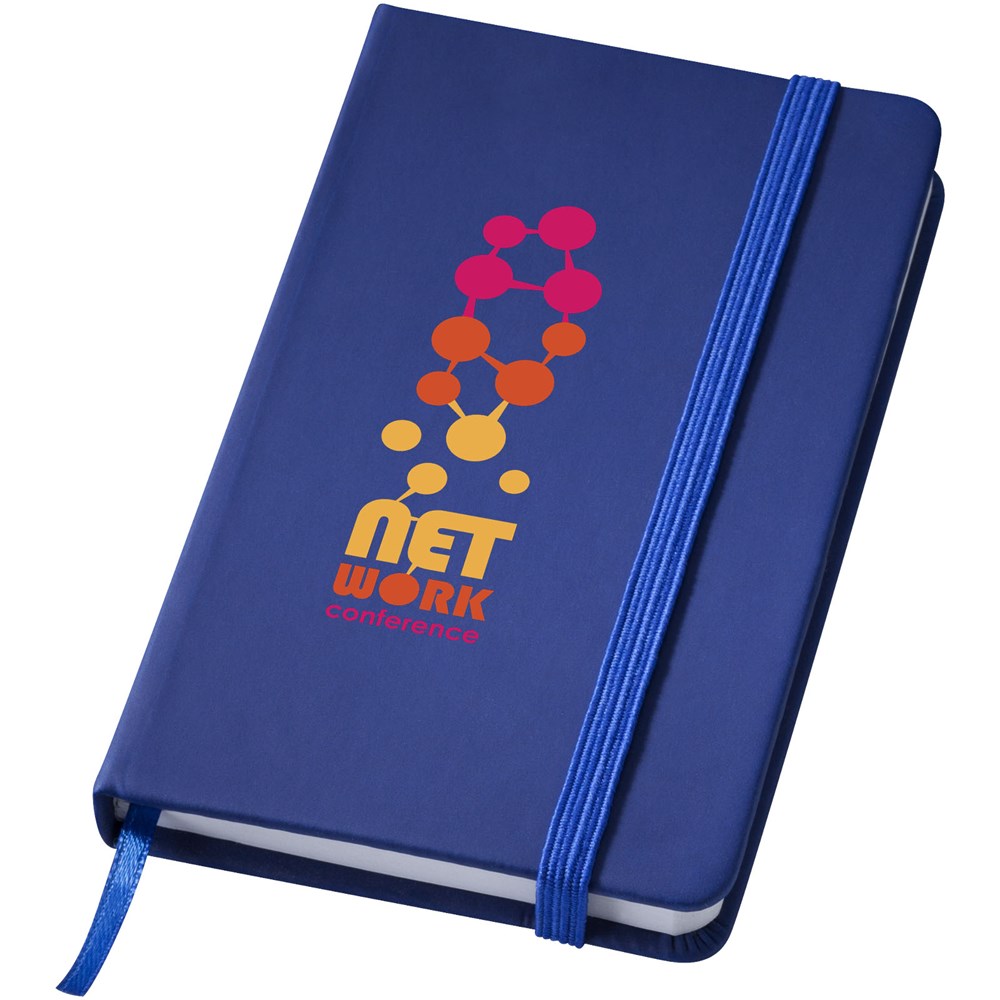 Notizbuch ca. A7 mit farblich passendem Gummibandverschluss und Band. Mit 60 Blatt (60 g/m²) liniertem Papier.