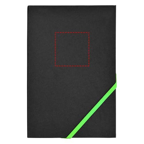A5 Notizbuch mit 80 Blatt beigem Papier (70 g/m²) und diagonalem Gummibandverschluss und Kanten in auffallenden Neonfarben.