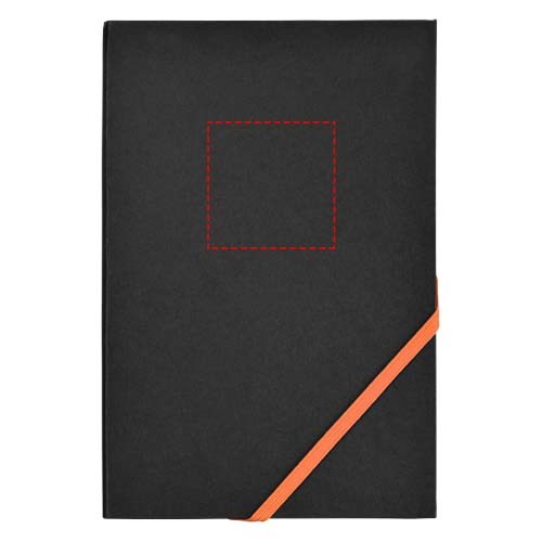 A5 Notizbuch mit 80 Blatt beigem Papier (70 g/m²) und diagonalem Gummibandverschluss und Kanten in auffallenden Neonfarben.