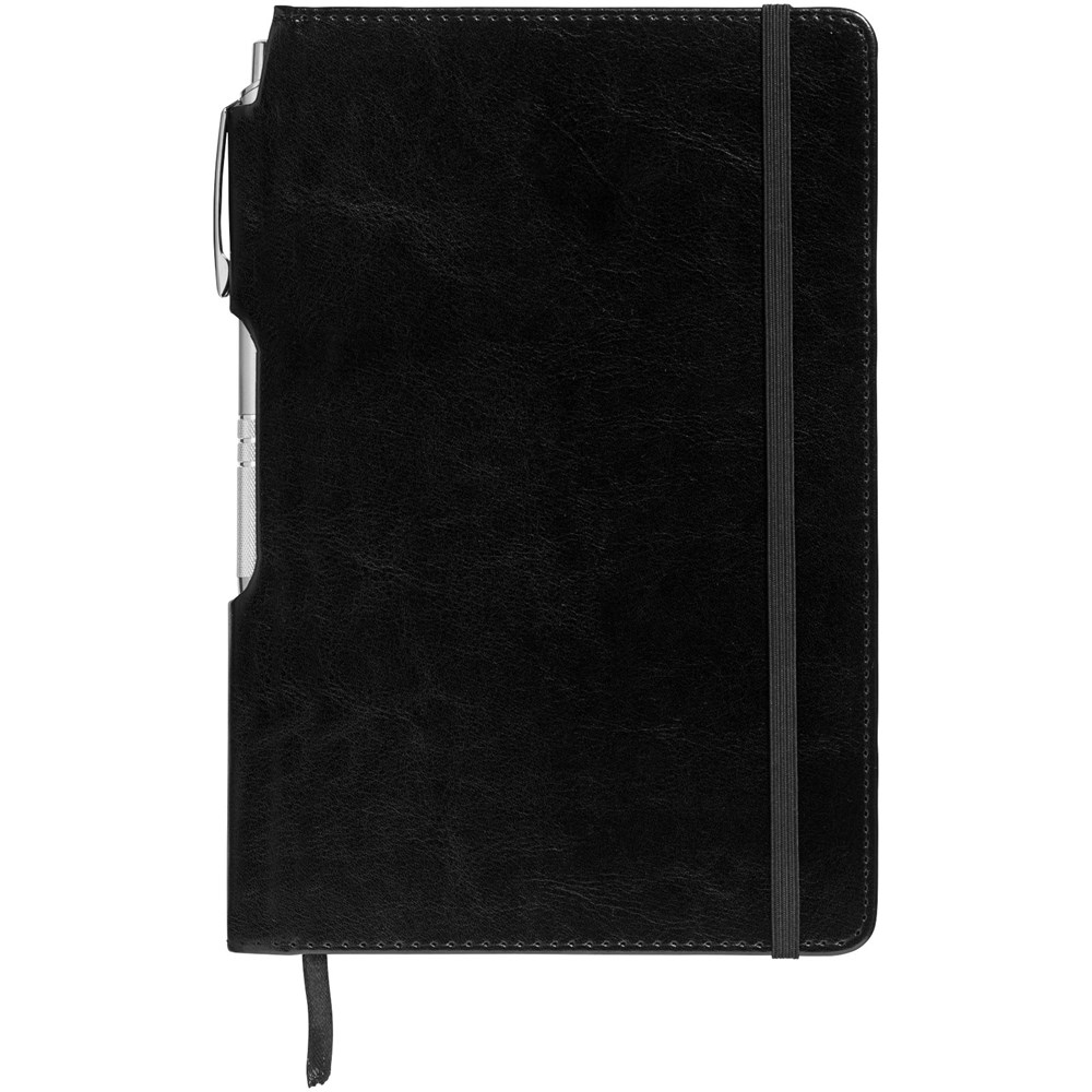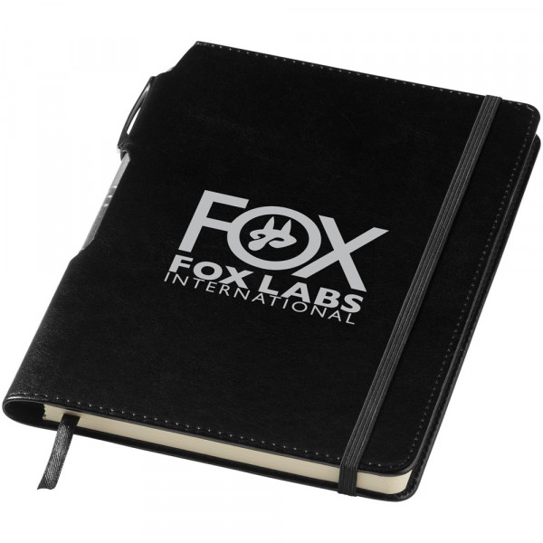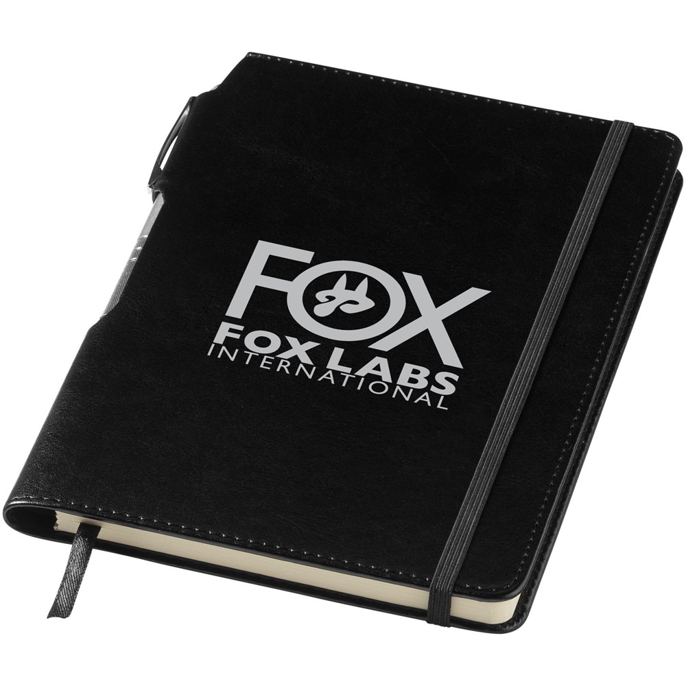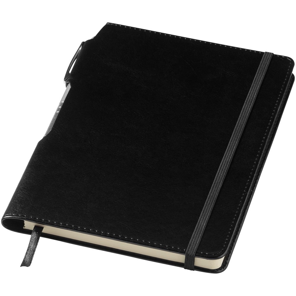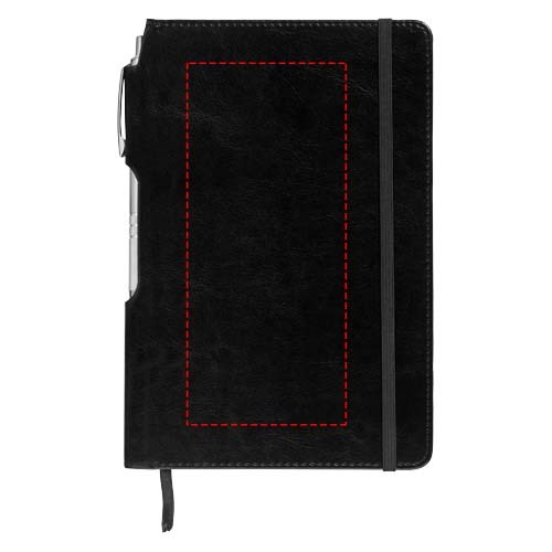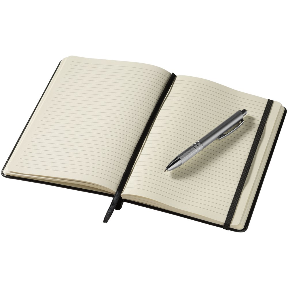 A5 Notizbuch mit 80 Blatt cremefarbigem liniertem Papier (70 g/m²) mit passendem Leseband und Gummibandverschluss. Mit silbernem Kugelschreiber in der Stiftschlaufe.