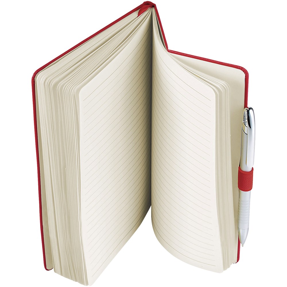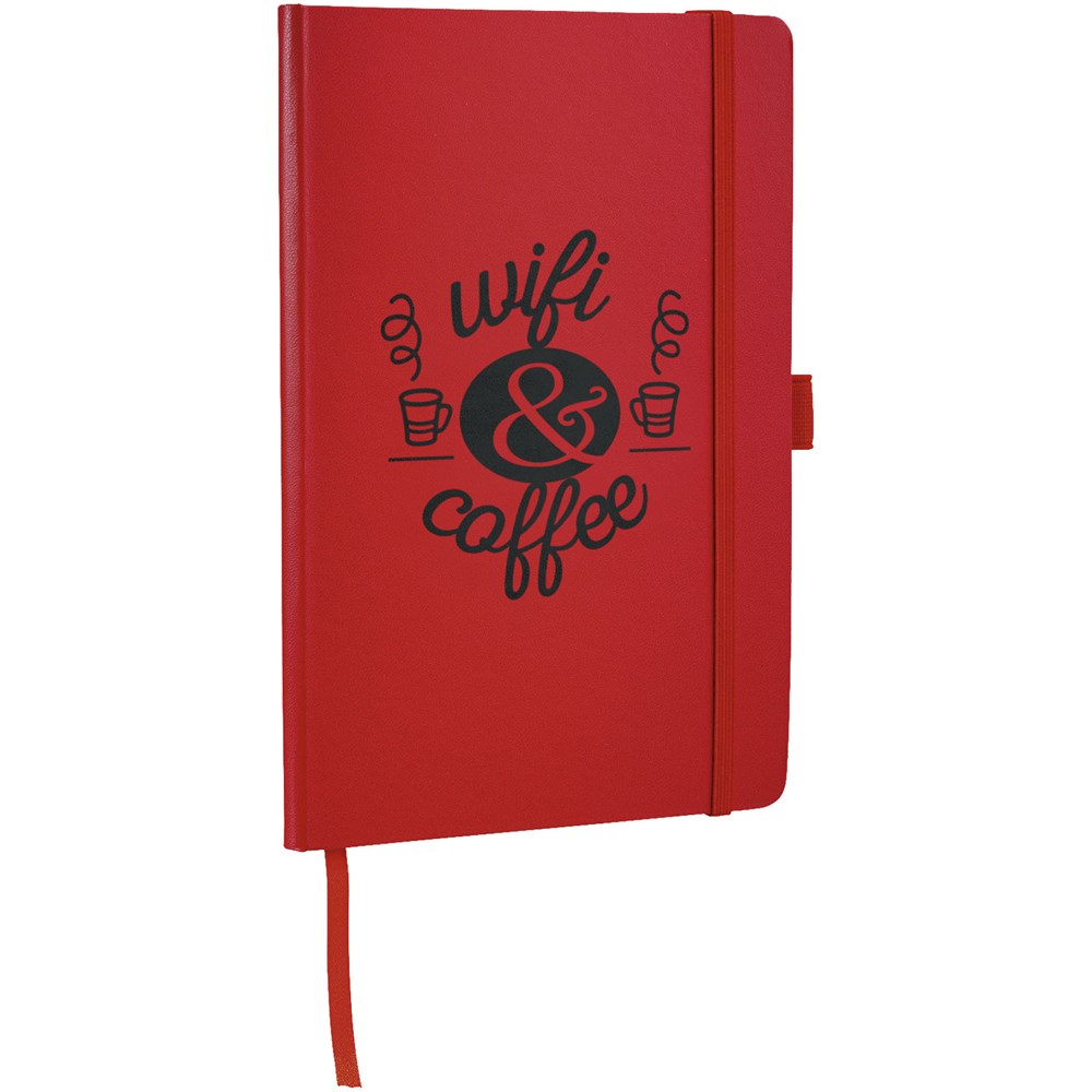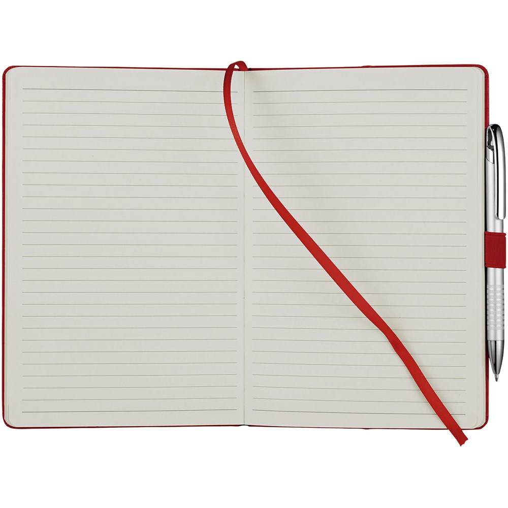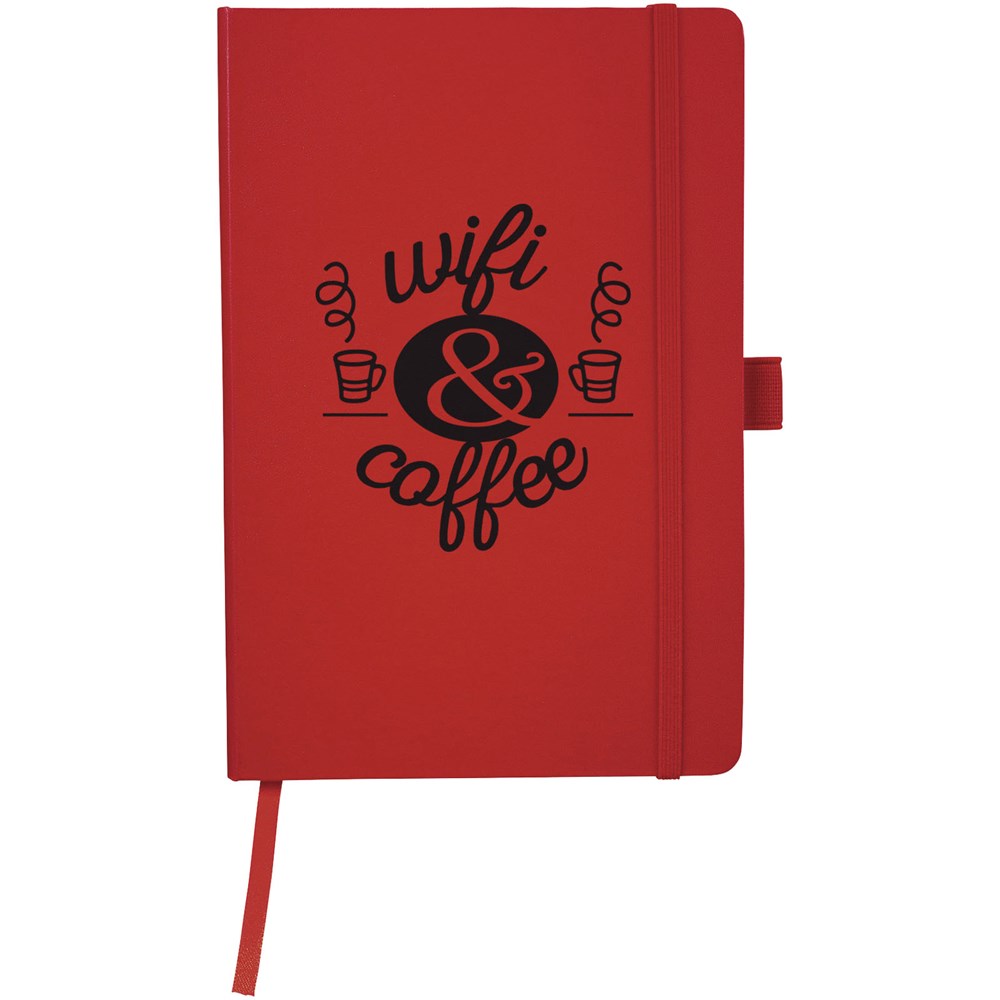 A5 Notizbuch mit rückseitiger Falte für einfaches Umblättern. Inklusive Gummiband zum Verschließen, Leseband und 80 Blatt (80 g), liniertem Papier.