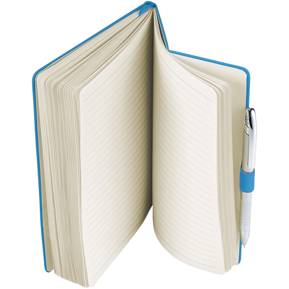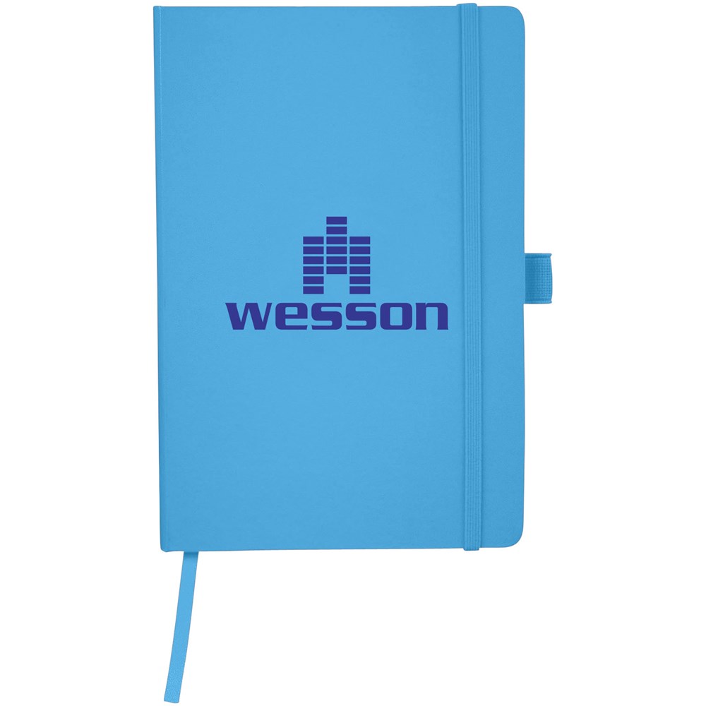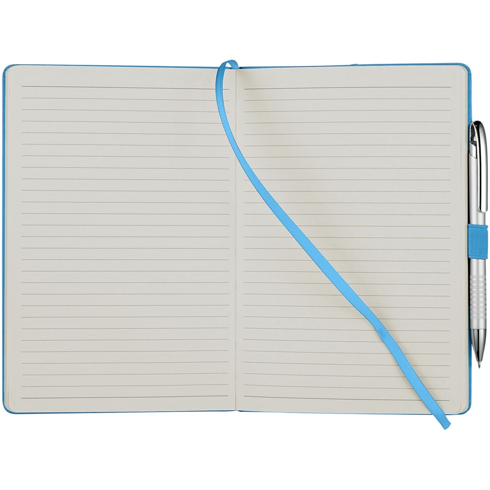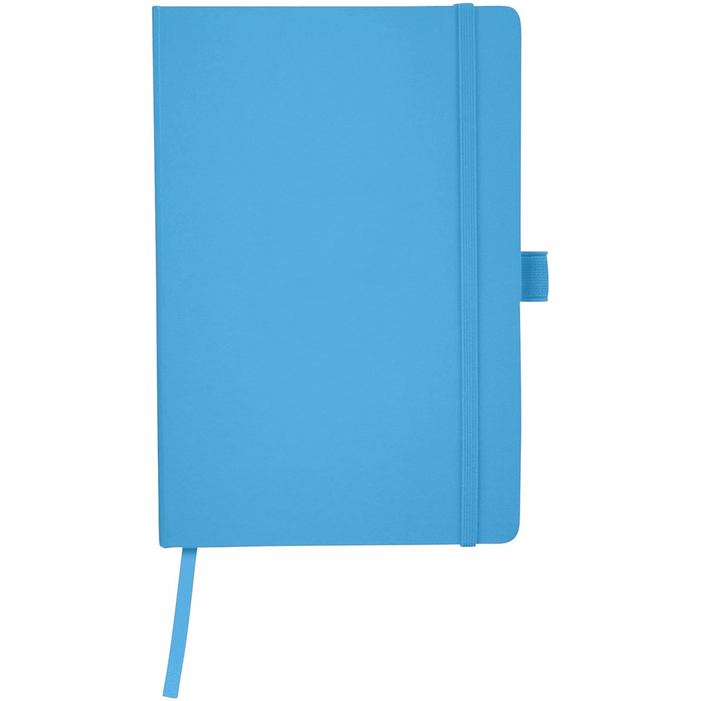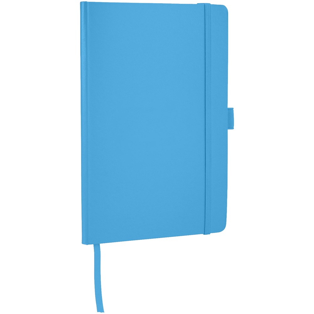 A5 Notizbuch mit rückseitiger Falte für einfaches Umblättern. Inklusive Gummiband zum Verschließen, Leseband und 80 Blatt (80 g), liniertem Papier.