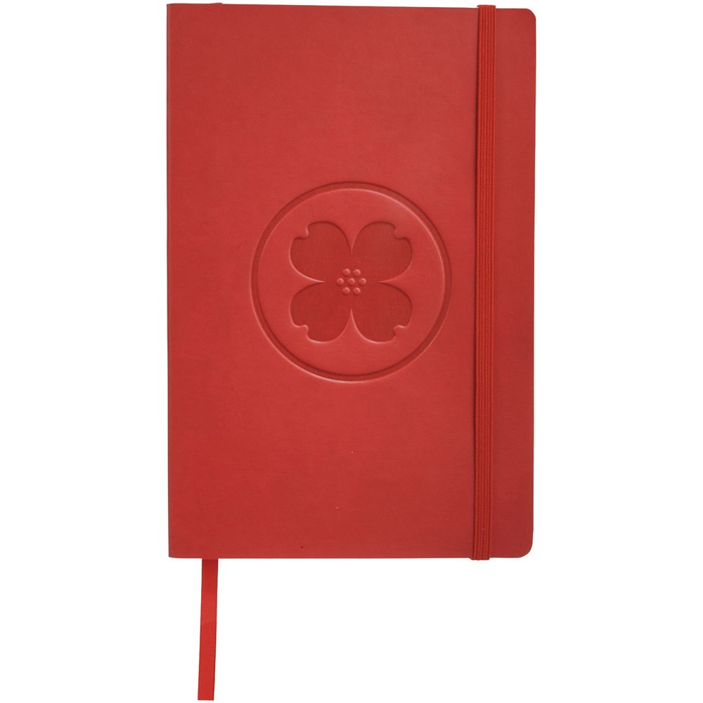Softcover Notizbuch (A5 Format) mit integriertem Gummibandverschluss, Leseband, Dokumentenfach an der Rückseite innen und 80 Blatt (80 g) liniertem Papier.