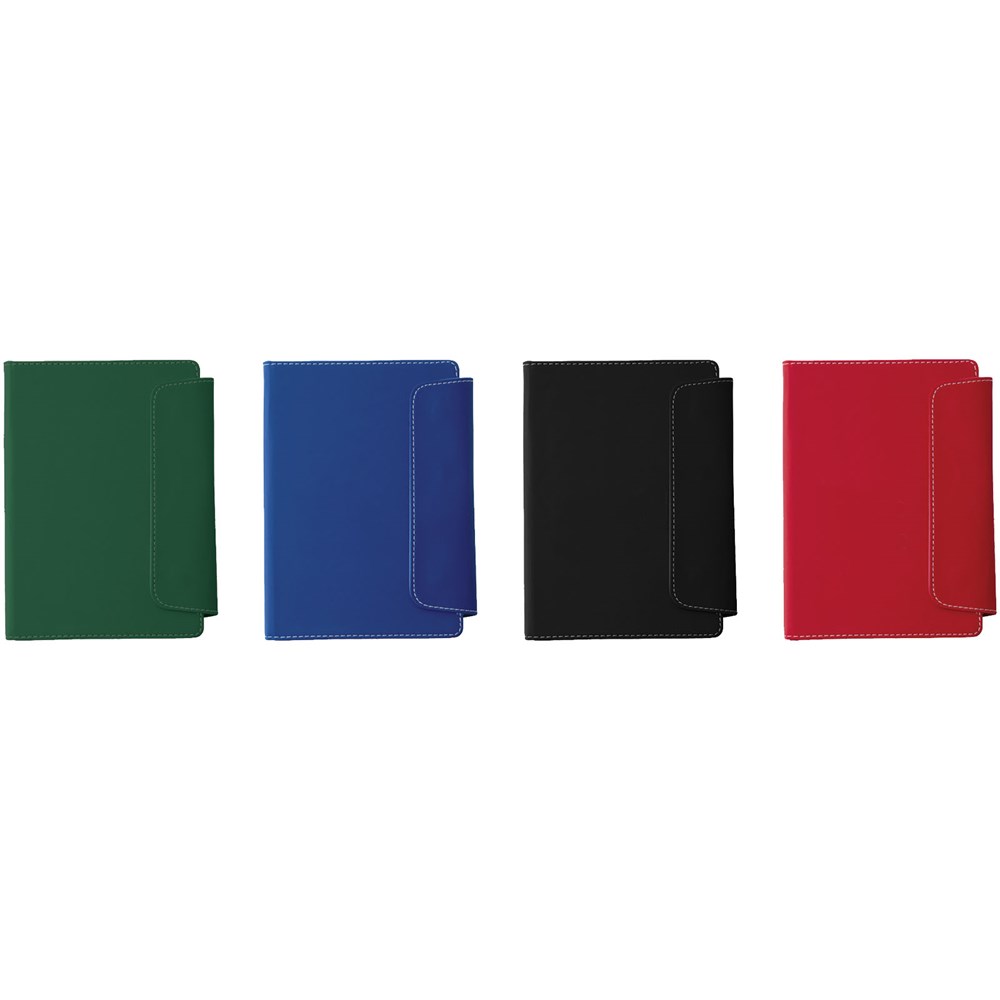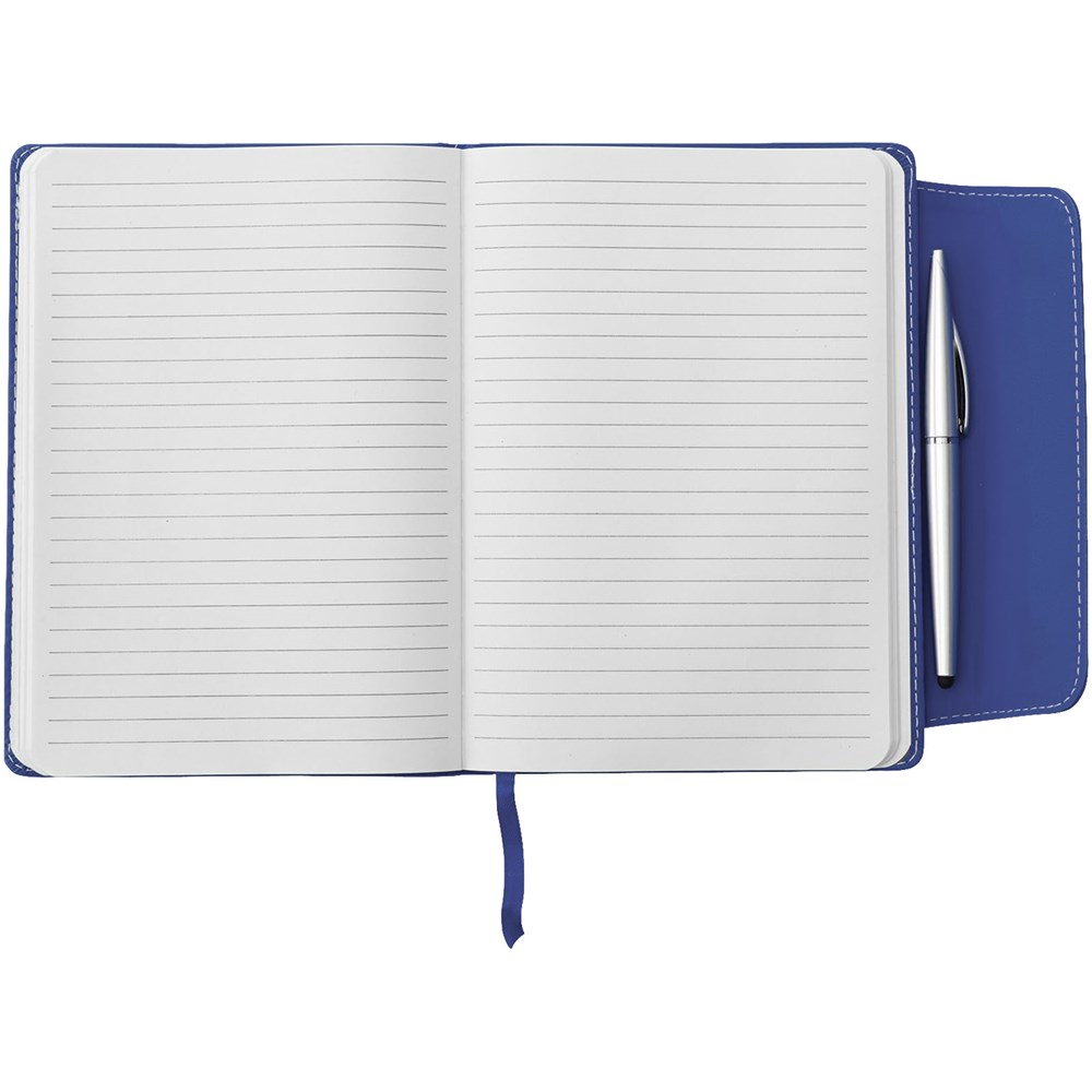 Gebundenes A5 Notizbuch mit Magnetverschluss. Mit Stylus Kugelschreiber aus Kunststoff und 80 Blatt liniertes, weißes Papier (70 g/m²).