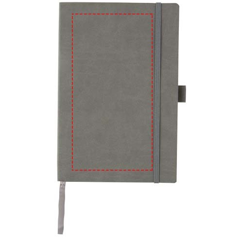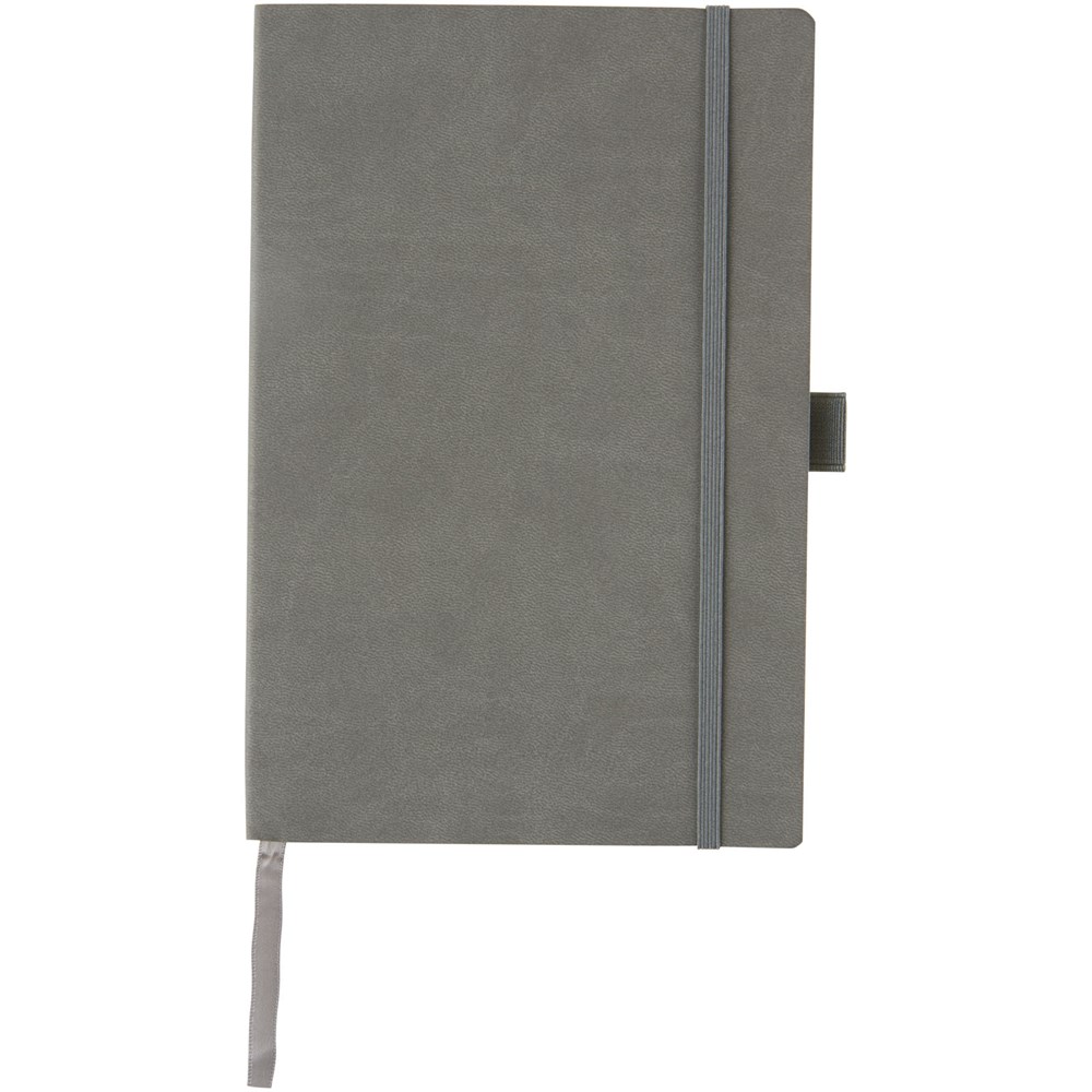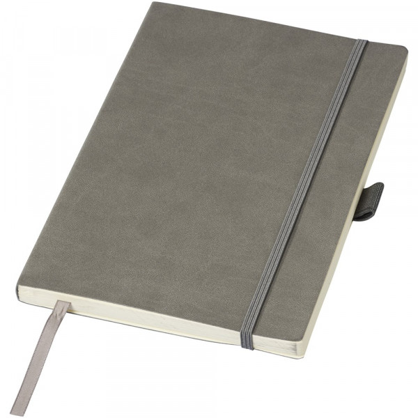 Flexibles Notizbuch mit weichem Einband (A5 Größen-Referenz) mit integriertem Gummiband-Verschluss, Lesezeichen-Bändchen, Stiftschlaufe, Dokumententasche an der inneren Rückseite und 80 Blatt (80 g/m²) cremefarbenem liniertem Papier. Verpackt in einer schwarzen Hülle.