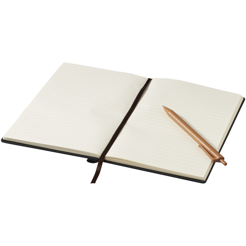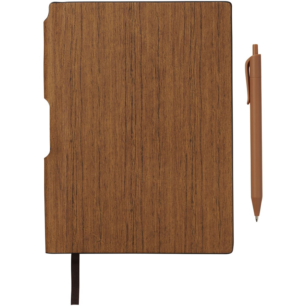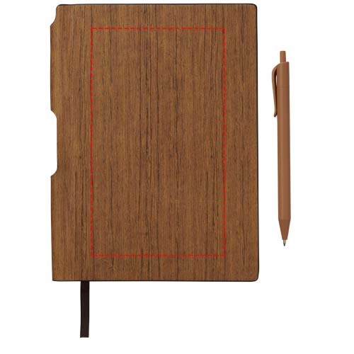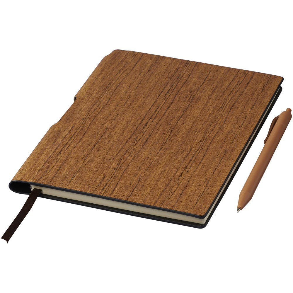 A5 gebundenes Notizbuch in Holz Optik, enthält 80 Blatt, cremefarben (70 g/m²), liniert, inkl. passendem Kunststoff Kugelschreiber, der am Buchrücken befestigt ist.