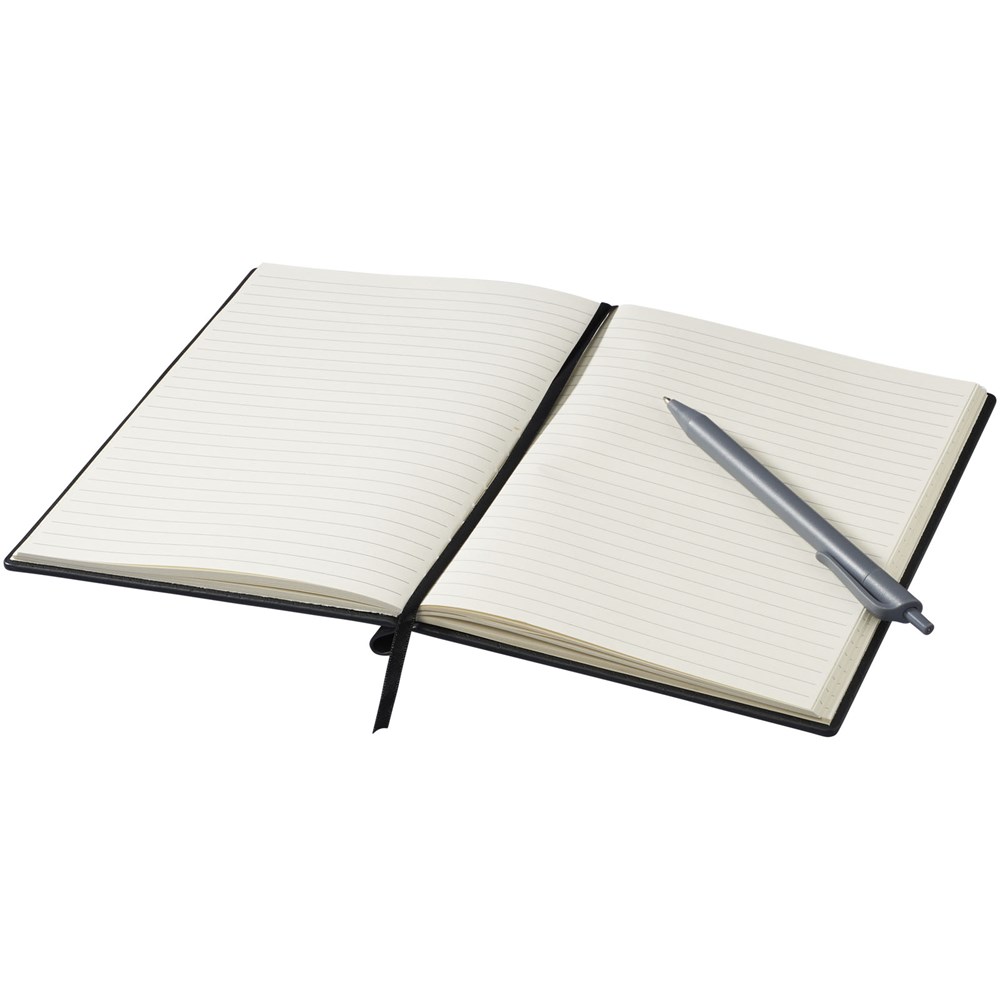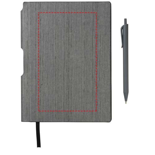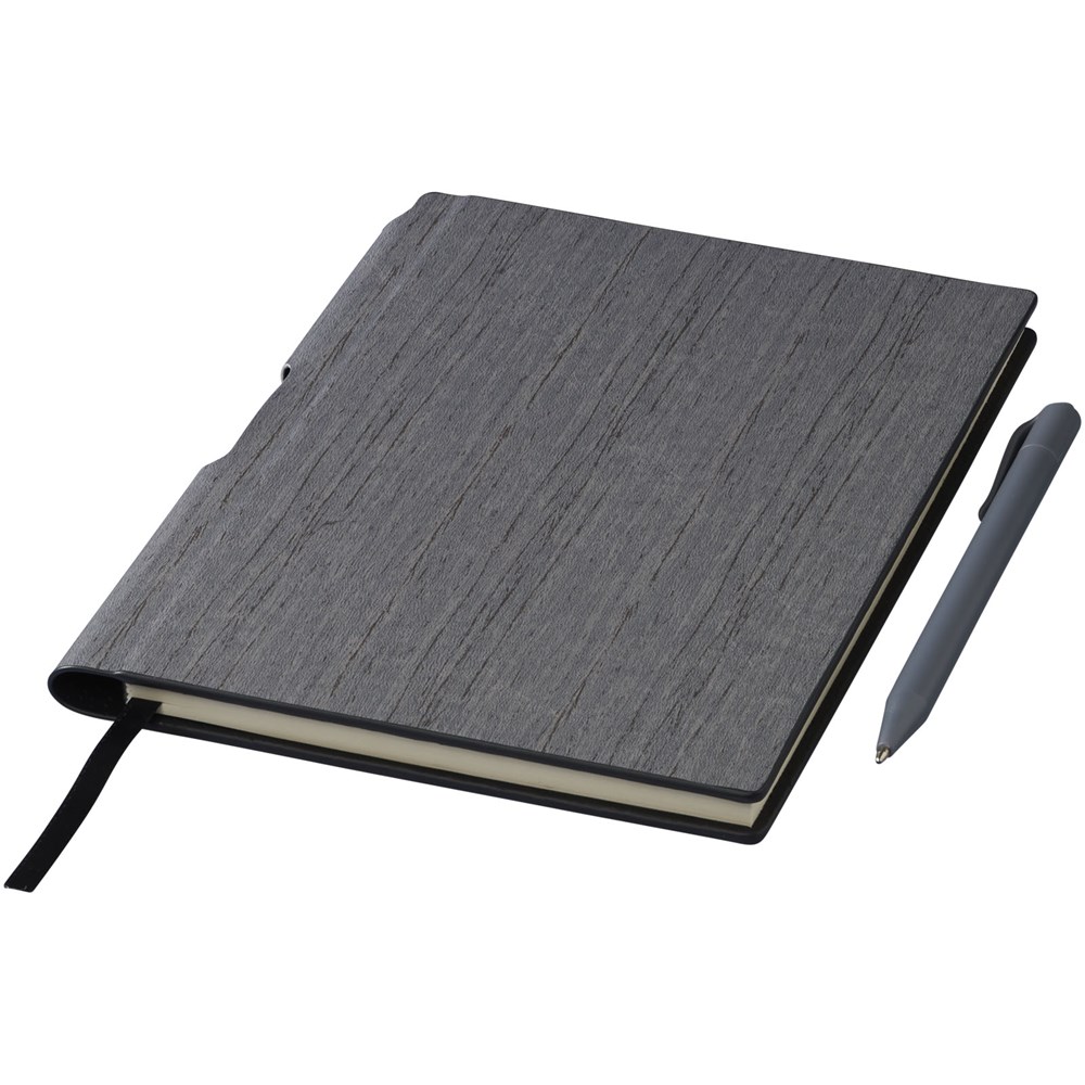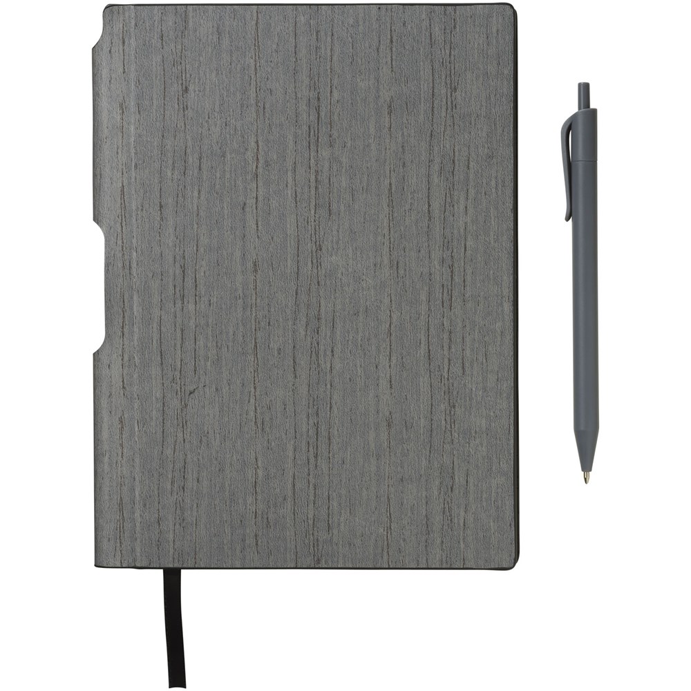 A5 gebundenes Notizbuch in Holz Optik, enthält 80 Blatt, cremefarben (70 g/m²), liniert, inkl. passendem Kunststoff Kugelschreiber, der am Buchrücken befestigt ist.