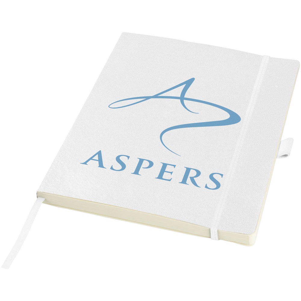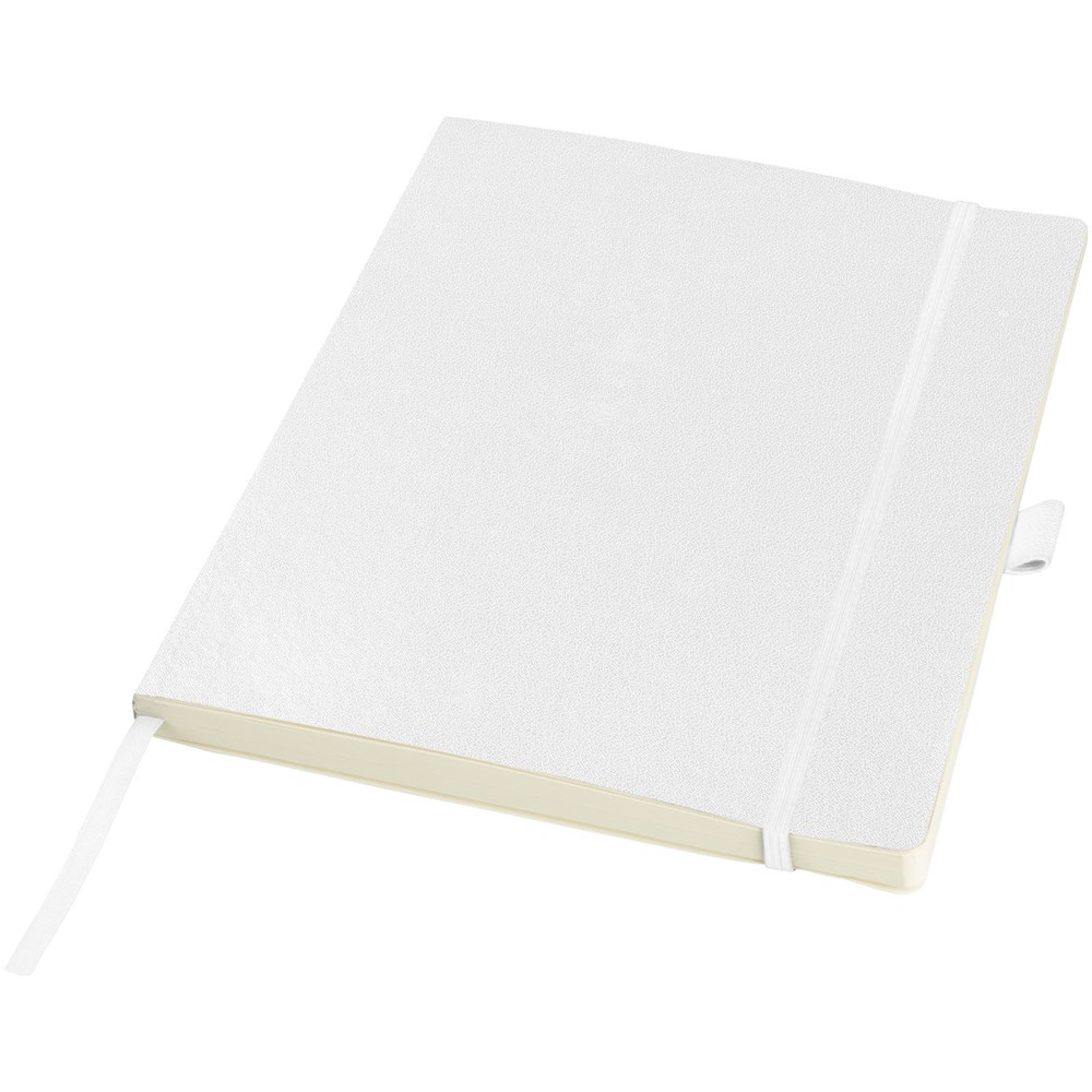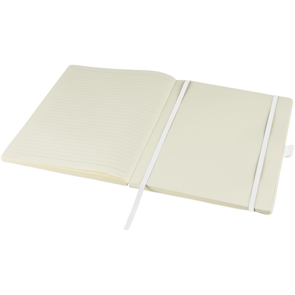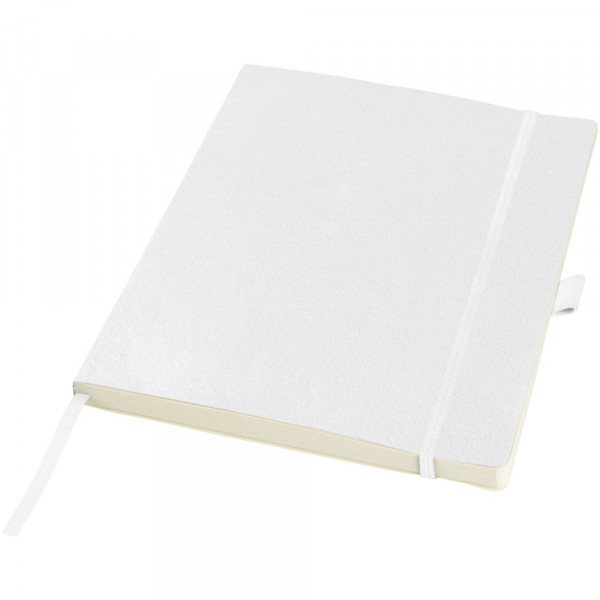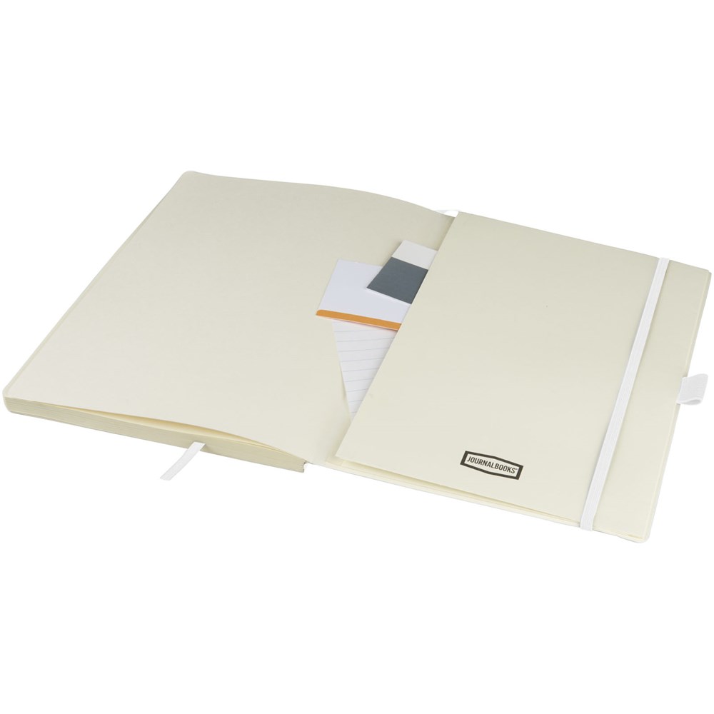 Flexibles Notizbuch in iPad Größe für angenehmes Tragen mit einem Tablet. Enthält 48 Blatt (80 g/m²) cremefarbenes, liniertes und 48 Blatt weißes Papier, Stiftschleife, elastischen Verschluss, Bandmarker und Dokumententasche auf der Innenseite der Rückseite. Verpackt in einer weißen Hülle.