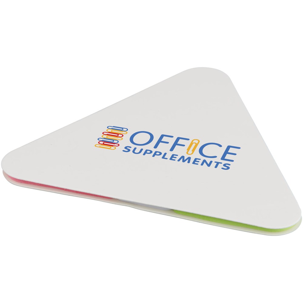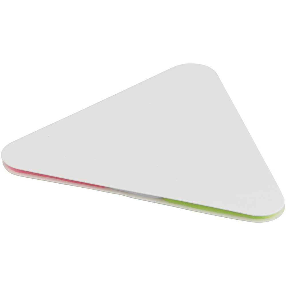 Dreieckiger Haftnotizblock mit mehrfarbigen Haftnotizzetteln in Weiß und drei verschiedenen Farben. mehr