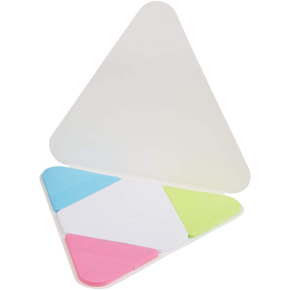 Dreieckiger Haftnotizblock mit mehrfarbigen Haftnotizzetteln in Weiß und drei verschiedenen Farben.