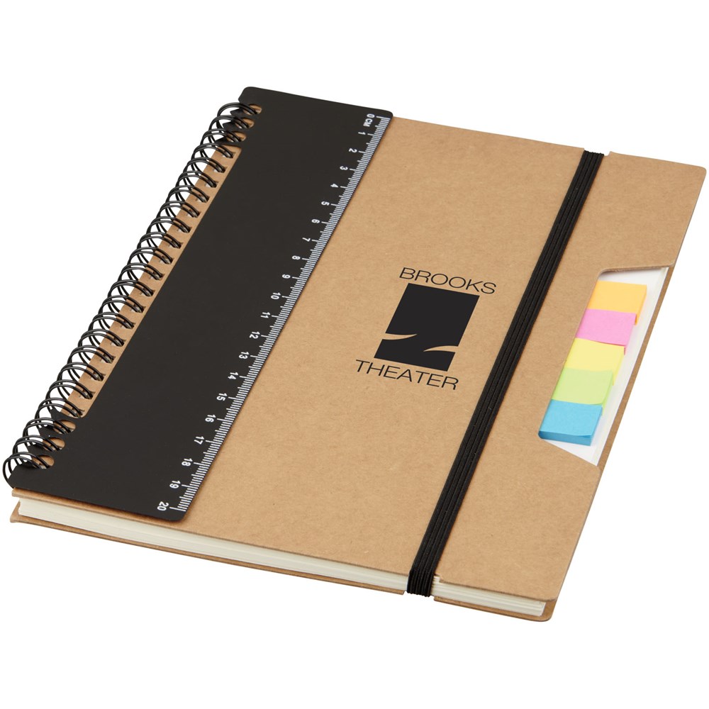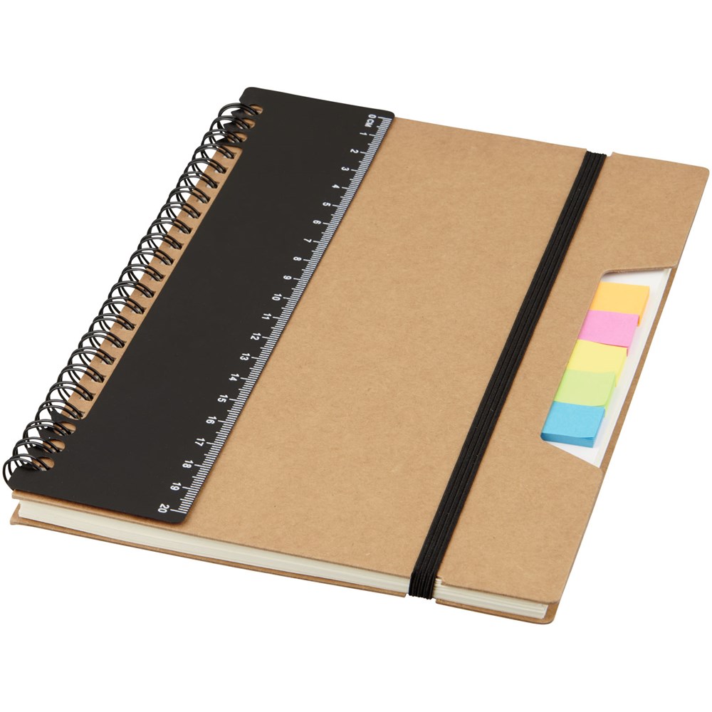 Ein Notizbuch in der Größe A5 mit Gummibandverschluss in passender Farbe und Lineal mit Zentimeter auf der Vorderseite und Zoll auf der Rückseite. Wird mit 100 Haftnotizen, 25 pro Farbe, geliefert. Mit 70 Blatt liniertem 70 g/m² Papier.