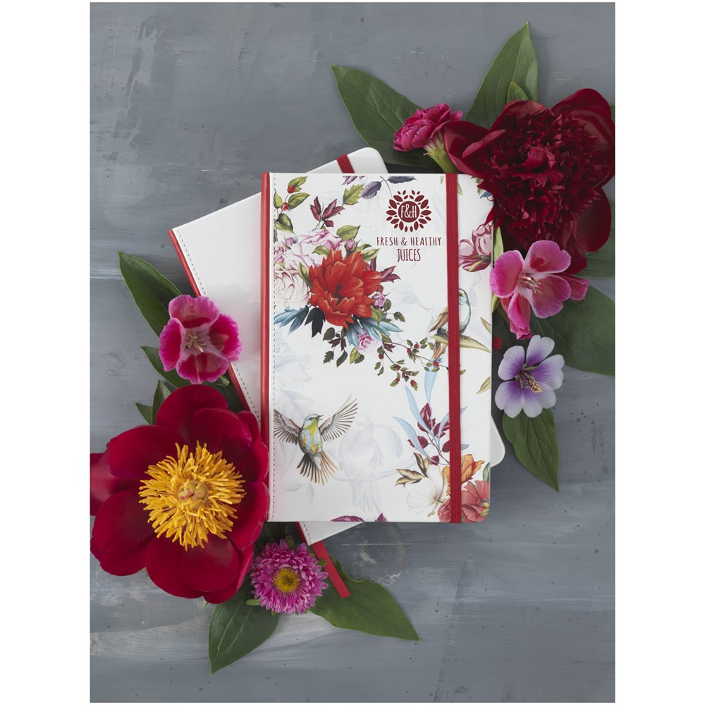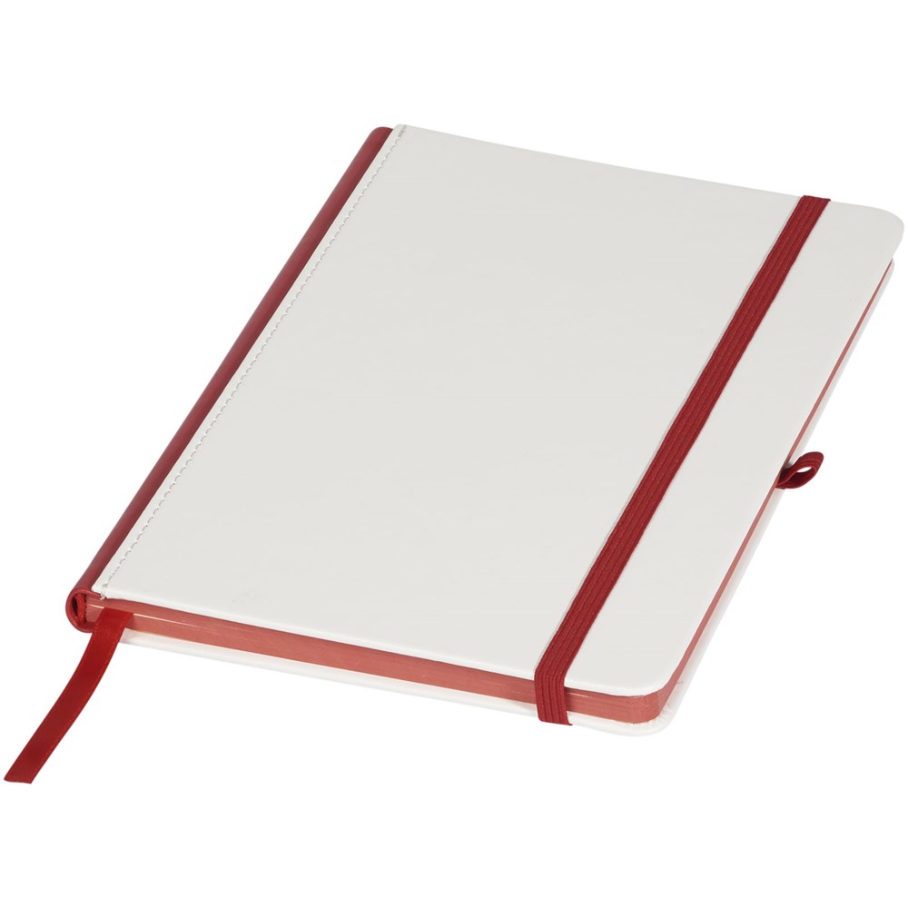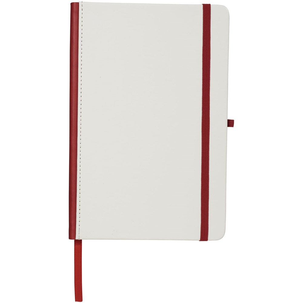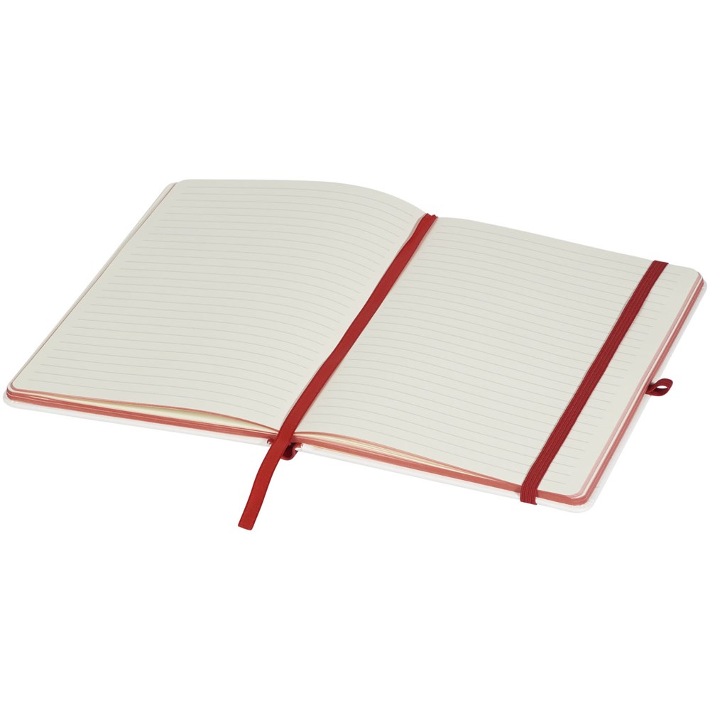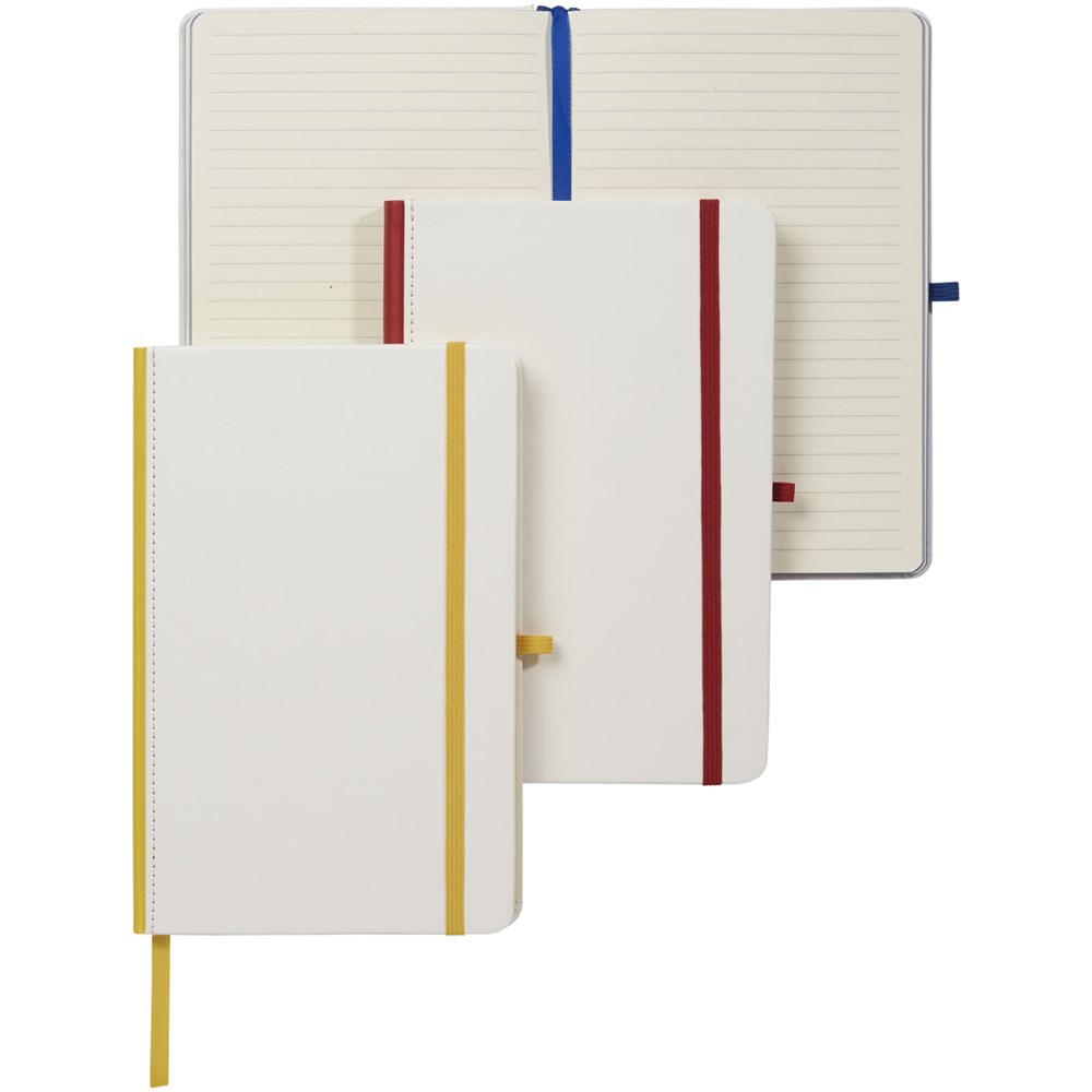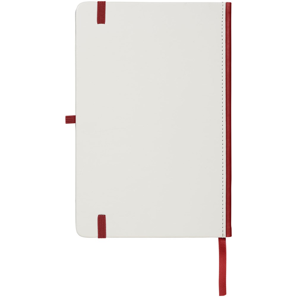 Gebundenes A5-Notizbuch mit weißer Beschichtung und farbigem Rücken. Perfekt für einen Digitaldruck mit vollständiger Abdeckung. Der elastische Verschluss, das Band-Lesezeichen und die elastische Stiftschlaufe passen farblich zum Rücken. 80 g/m², 80 Blatt cremefarbenes liniertes Papier.