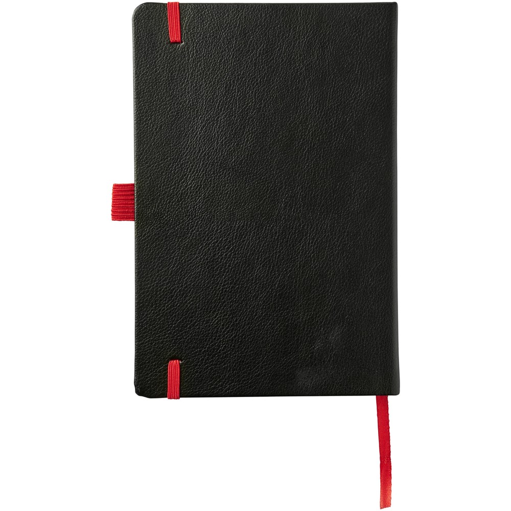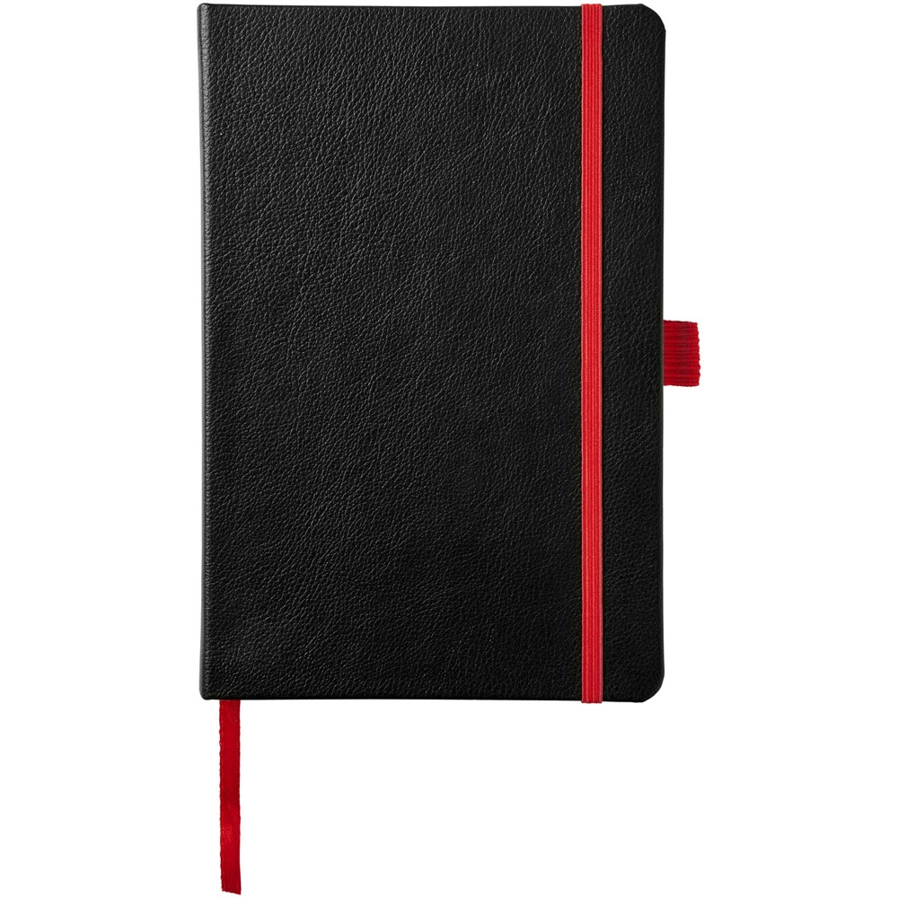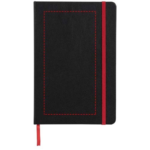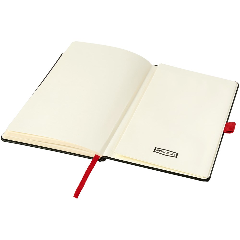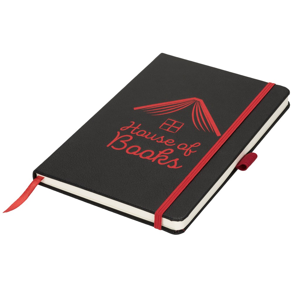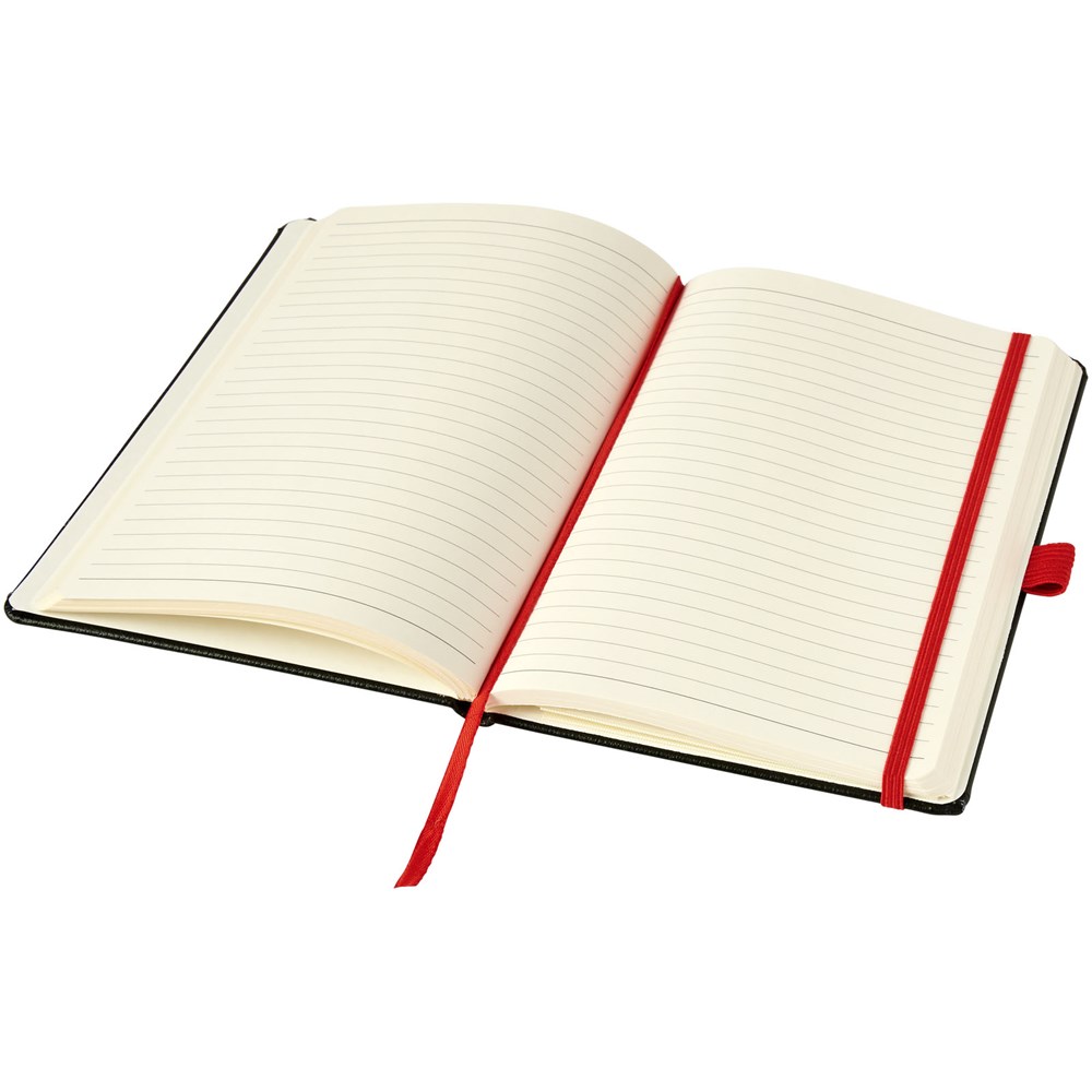 Das gebundene Notizbuch im A5-Format zeigt Ihr Logo oder Ihre Marke in blau, rot, grün oder gelb nach einer Lasergravur. Inklusive einem farblich passenden elastischen Verschluss, einem Band-Lesezeichen und einer elastische Stiftschlaufe. 80 g/m², 80 Blatt cremefarbenes liniertes Papier. Es verfügt auch über eine erweiterbare Tasche auf der Rückseite, um kleine Notizen zu verstauen. Verpackt in einer Hülle.