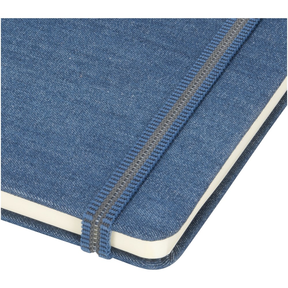 Ein A5-Notizbuch aus Jeansstoff mit 80 Blatt (80 g/m³) liniertem cremefarbigem Papier, Gummibandverschluss im besonderen Design, Bandlesezeichen und Stiftschlaufe. Verpackt in einem Geschenkkarton.