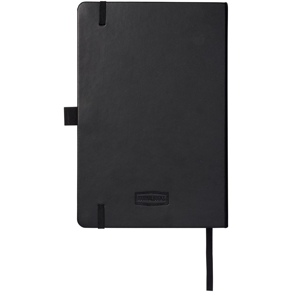 Kunstleder-A5-Notizbuch (14,2 x 21,4 cm, Lederimitat) mit Gummiband, Farbband, Stiftschlaufe und Akkordeon-Tasche an der Rückseite. Enthält 96 Blätter cremefarbenes Papier in 80 g/m2 und wird in einem Journalbook mit weißer Hülle angeboten.