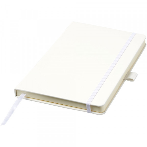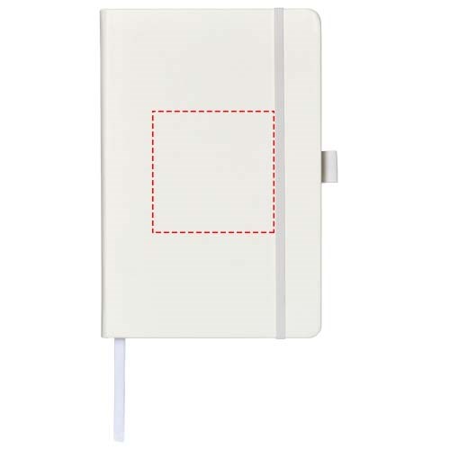 Kunstleder-A5-Notizbuch (14,2 x 21,4 cm, Lederimitat) mit Gummiband, Farbband, Stiftschlaufe und Akkordeon-Tasche an der Rückseite. Enthält 96 Blätter cremefarbenes Papier in 80 g/m2 und wird in einem Journalbook mit weißer Hülle angeboten.