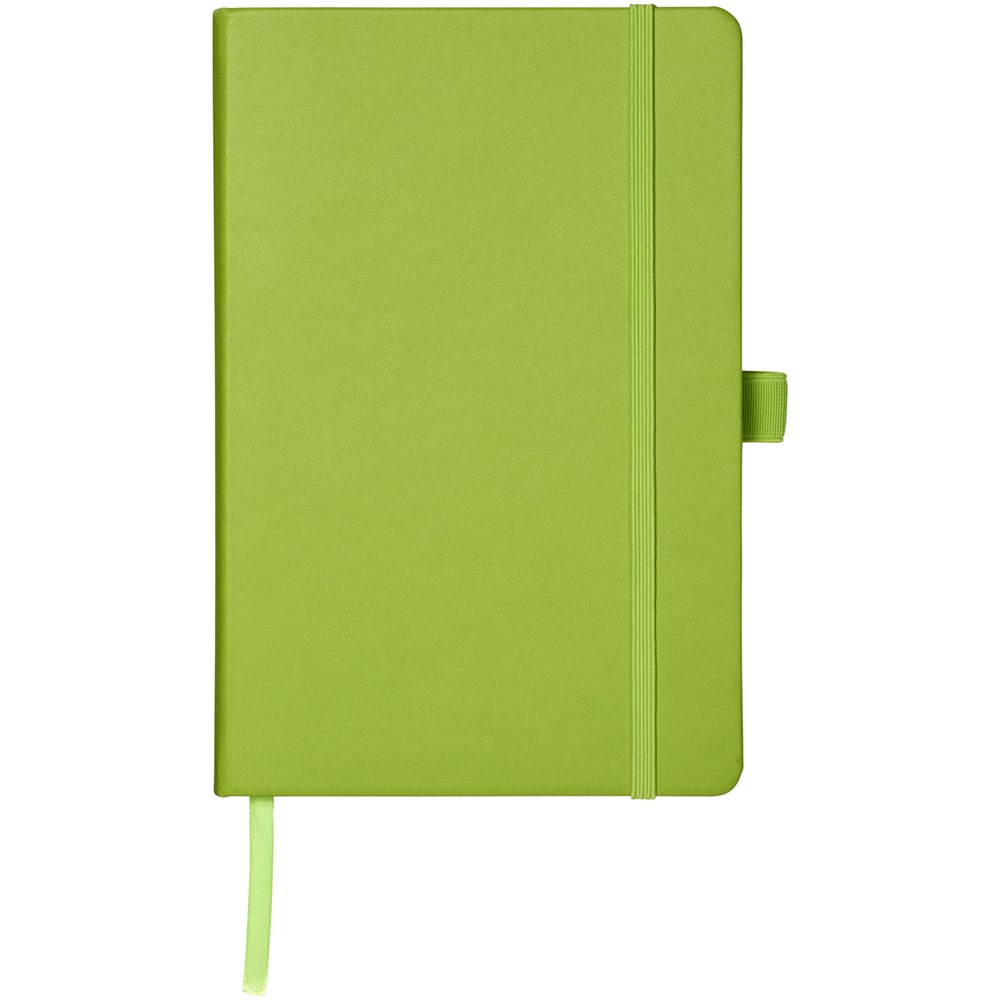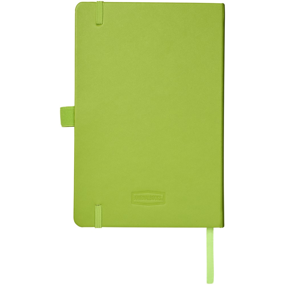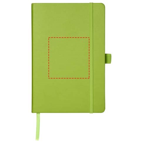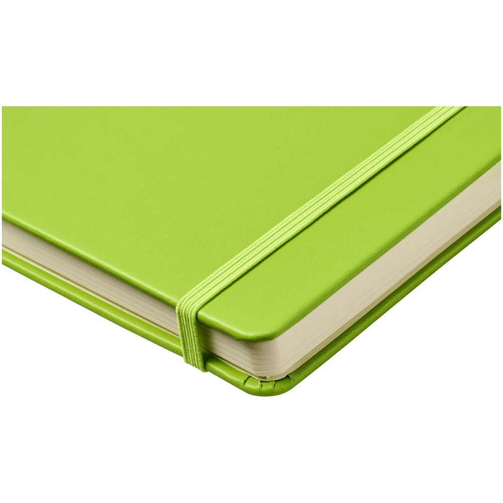Kunstleder-A5-Notizbuch (14,2 x 21,4 cm, Lederimitat) mit Gummiband, Farbband, Stiftschlaufe und Akkordeon-Tasche an der Rückseite. Enthält 96 Blätter cremefarbenes Papier in 80 g/m2 und wird in einem Journalbook mit weißer Hülle angeboten.