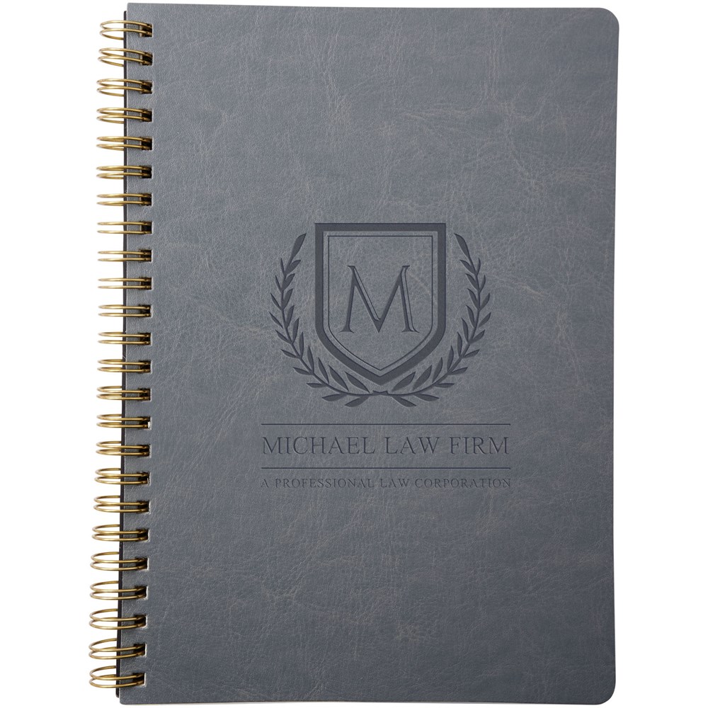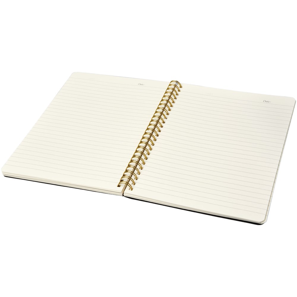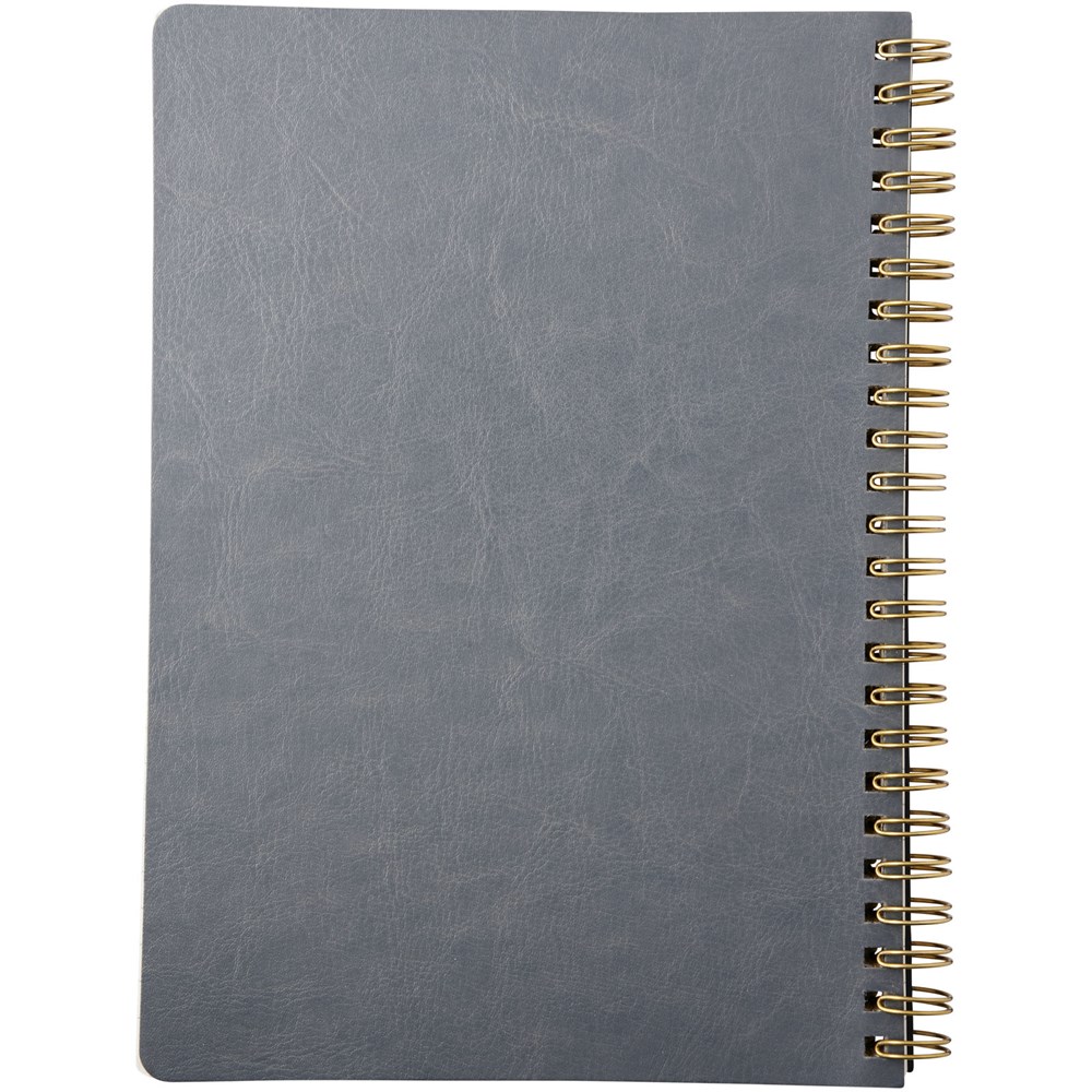 Kalender mit Spiralbindung im Lederlook, A5 mit Rindsleder-Thermo-PU und abgerundeten Ecken. Die Notizbuchhülle (15 x 21 cm) besteht aus 96 Blatt cremefarbenem, liniertem Papier in 70 g/m2.