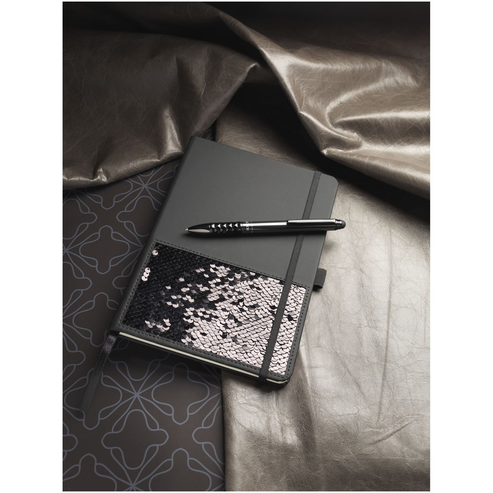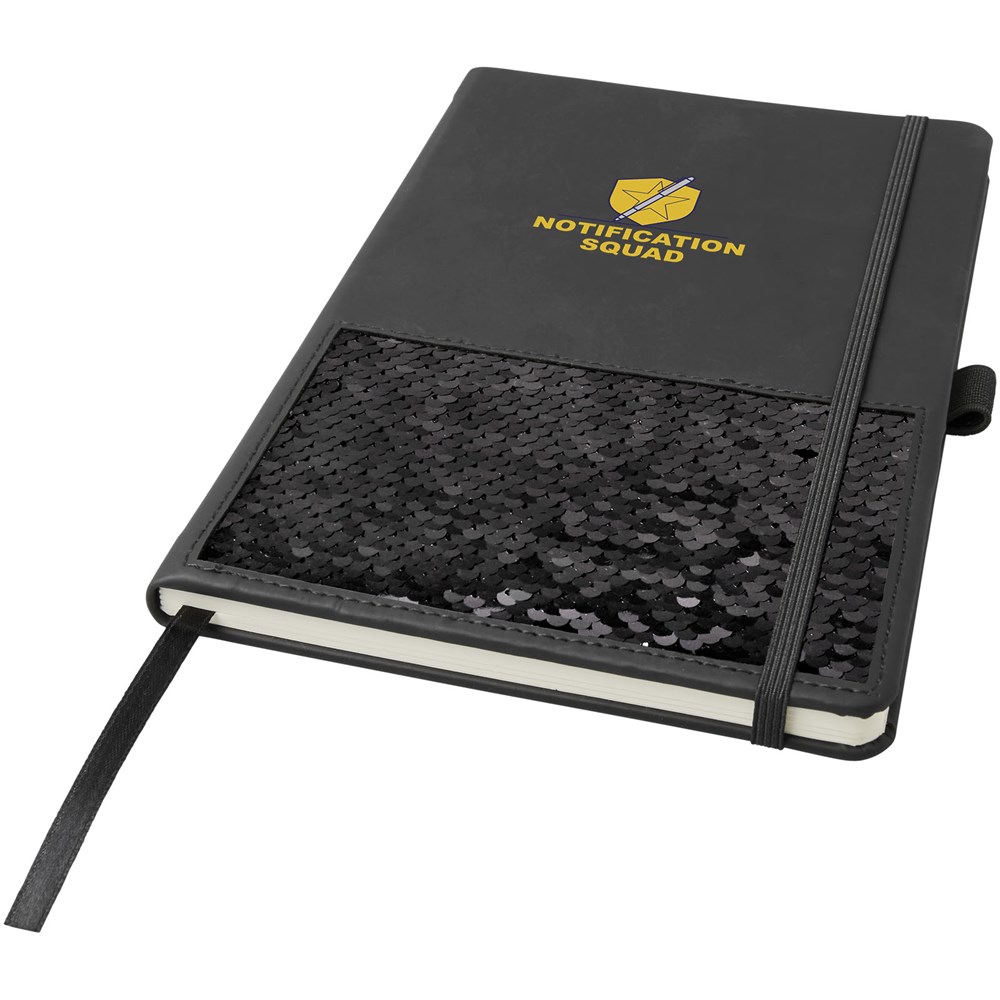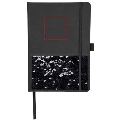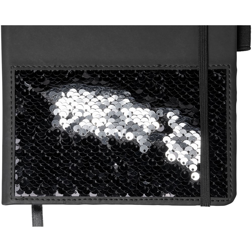 Notizbuch mit wendbaren Pailletten in Schwarz und Silber, geliefert in einer schwarzen Luxe-Hülle. Spezifikationen: Hülle (Thermo-PU): 15,6 x 21,2 cm, 70 g/m2 Papier, 80 Blatt cremefarbenes Papier, liniertes Format, elastischer Verschluss, Farbbandmarker und eine Stiftschlaufe.