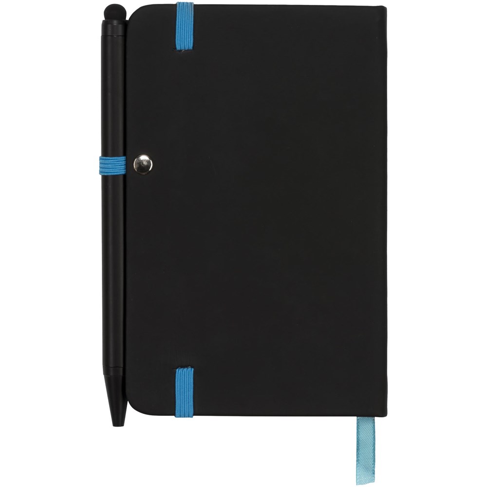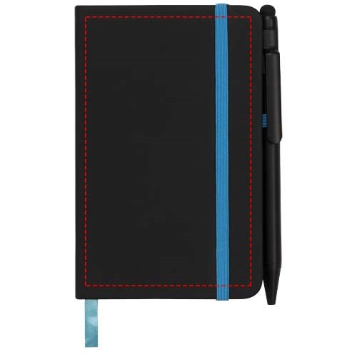 Modernes und elegantes schwarzes Notizbuch mit Einband mit weicher Haptik. Wird mit farbigem Rand und Seitenmarkierung in passender Farbe, Stiftschlaufe und Verschlussriemen geliefert. Wird mit einem einfarbig schwarzen Stylus-Kugelschreiber geliefert. Mit 96 Blatt (70 g/m²) cremefarbigem liniertem Papier.