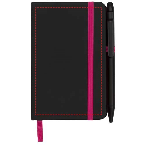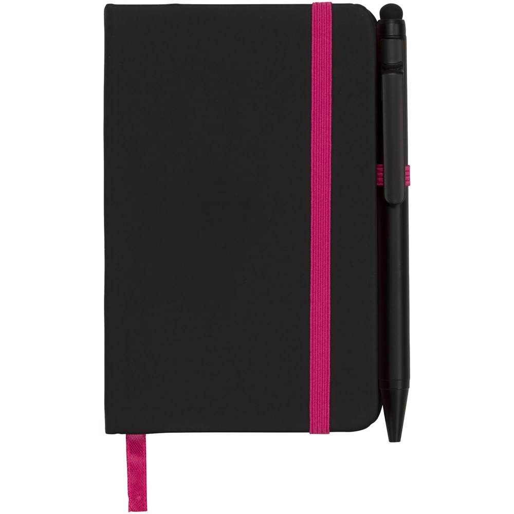 Modernes und elegantes schwarzes Notizbuch mit Einband mit weicher Haptik. Wird mit farbigem Rand und Seitenmarkierung in passender Farbe, Stiftschlaufe und Verschlussriemen geliefert. Wird mit einem einfarbig schwarzen Stylus-Kugelschreiber geliefert. Mit 96 Blatt (70 g/m²) cremefarbigem liniertem Papier.