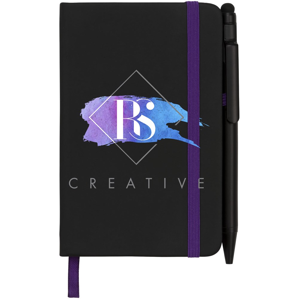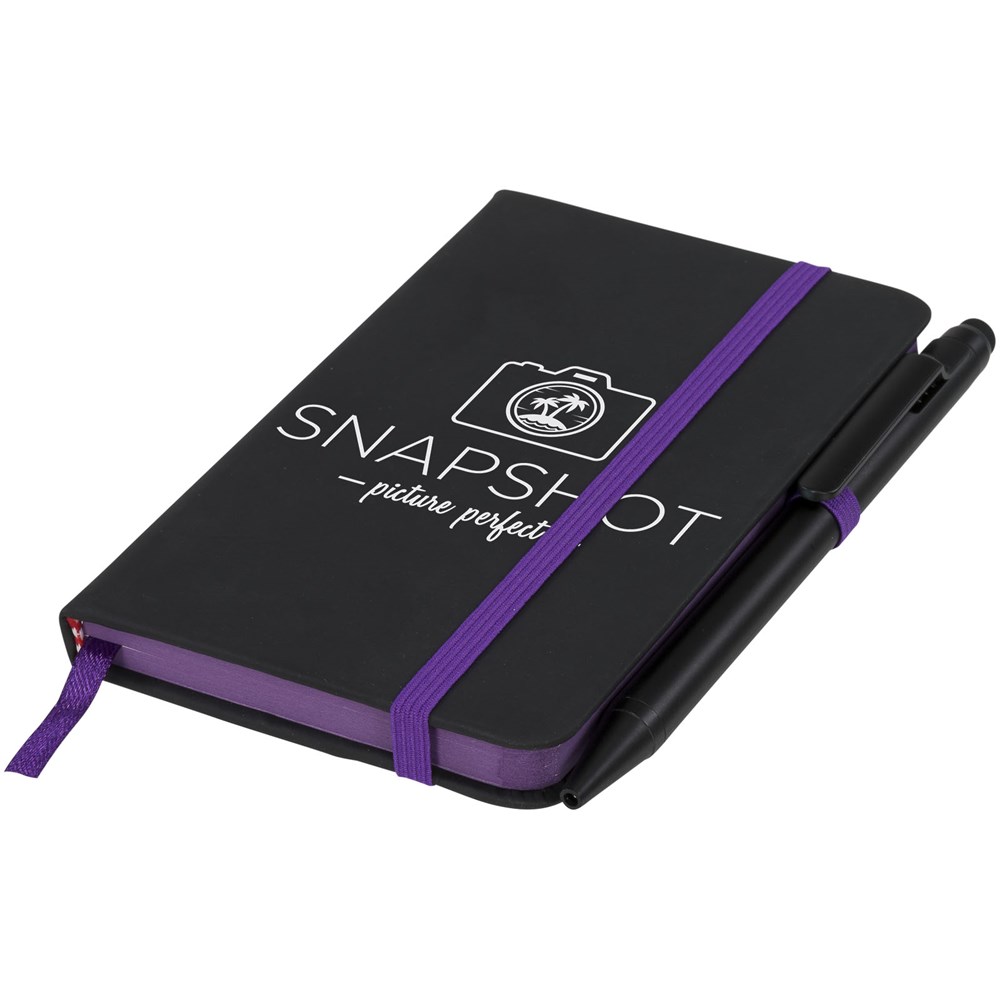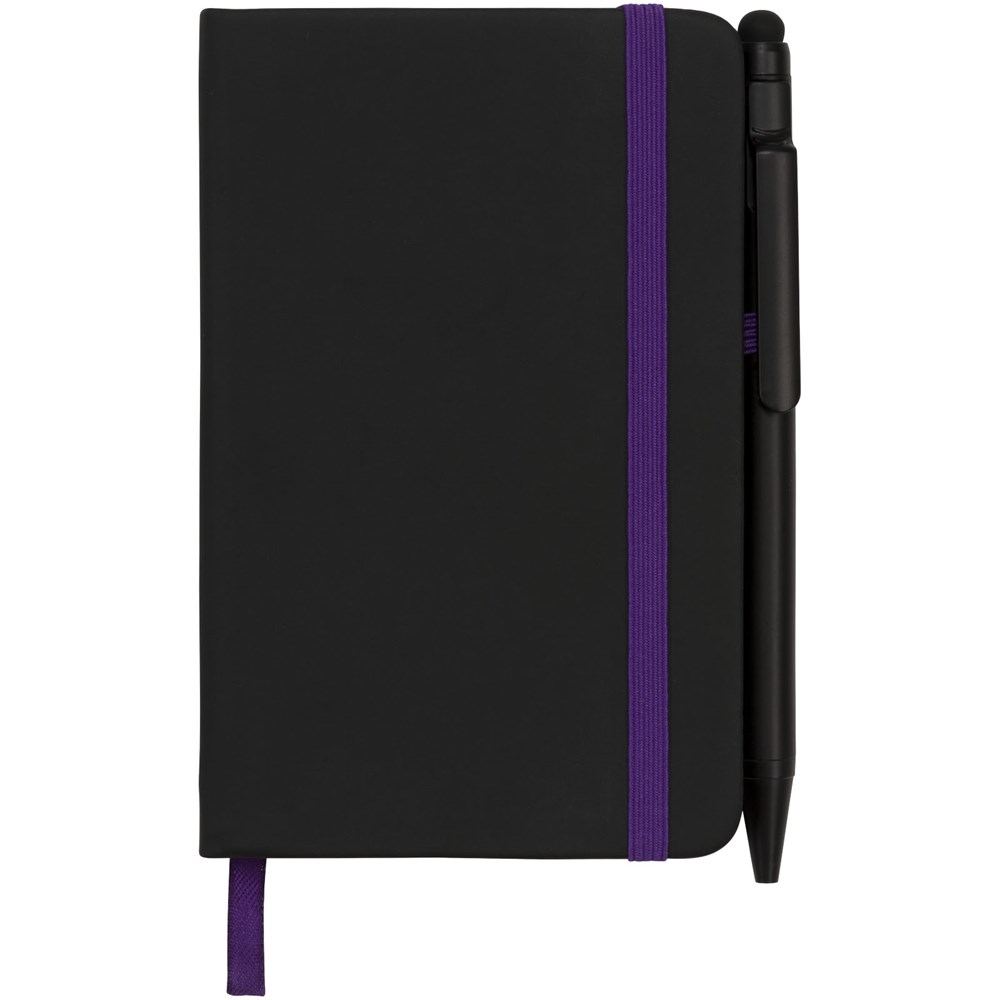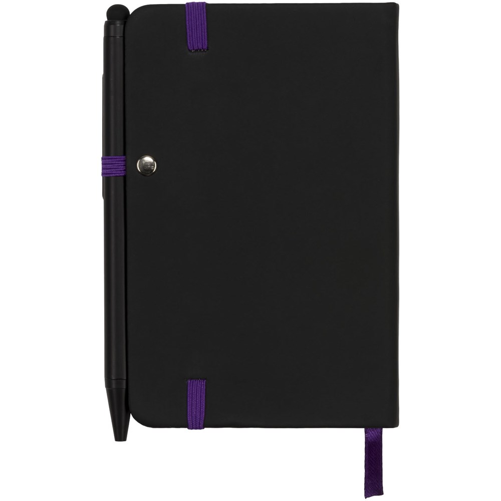 Modernes und elegantes schwarzes Notizbuch mit Einband mit weicher Haptik. Wird mit farbigem Rand und Seitenmarkierung in passender Farbe, Stiftschlaufe und Verschlussriemen geliefert. Wird mit einem einfarbig schwarzen Stylus-Kugelschreiber geliefert. Mit 96 Blatt (70 g/m²) cremefarbigem liniertem Papier.