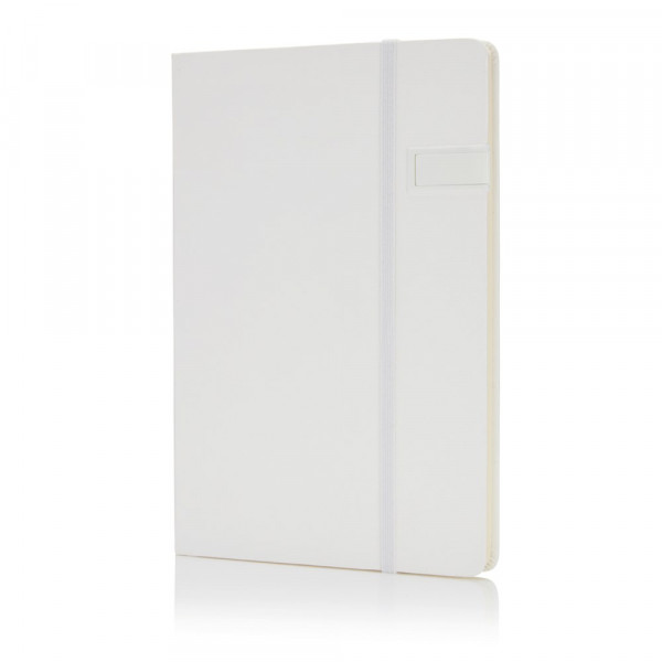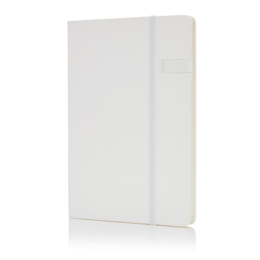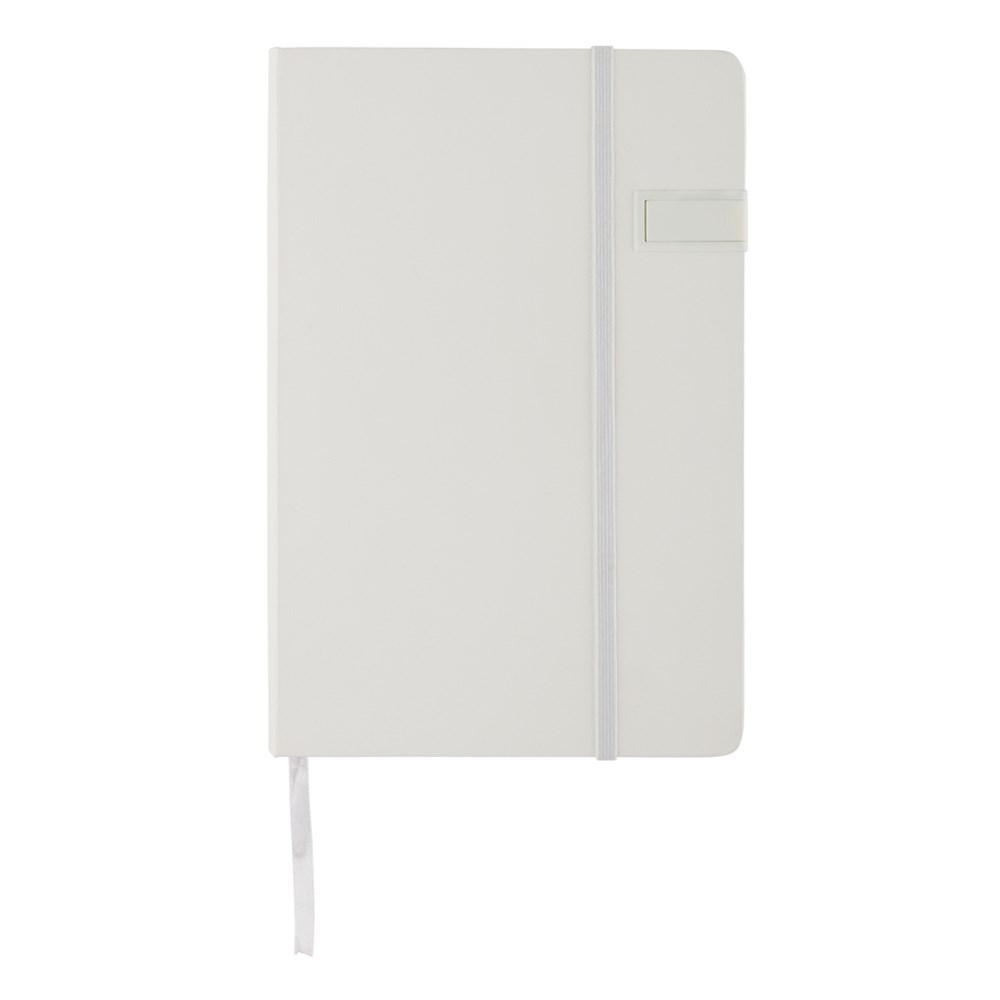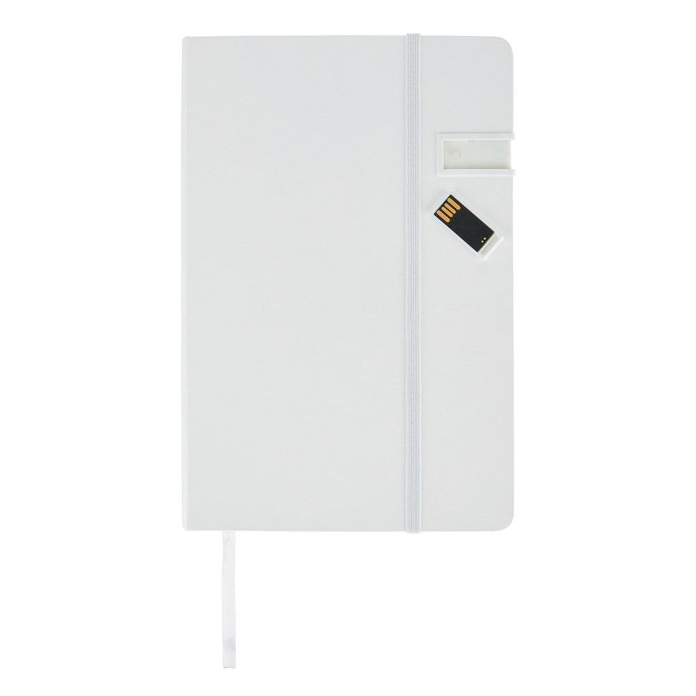 A5 Hardcover Notizbuch mit einem 4GB USB-Stick. Mit Seitentrenner und elastischem Verschlussband. 160 linierte Seiten, 80g/m²