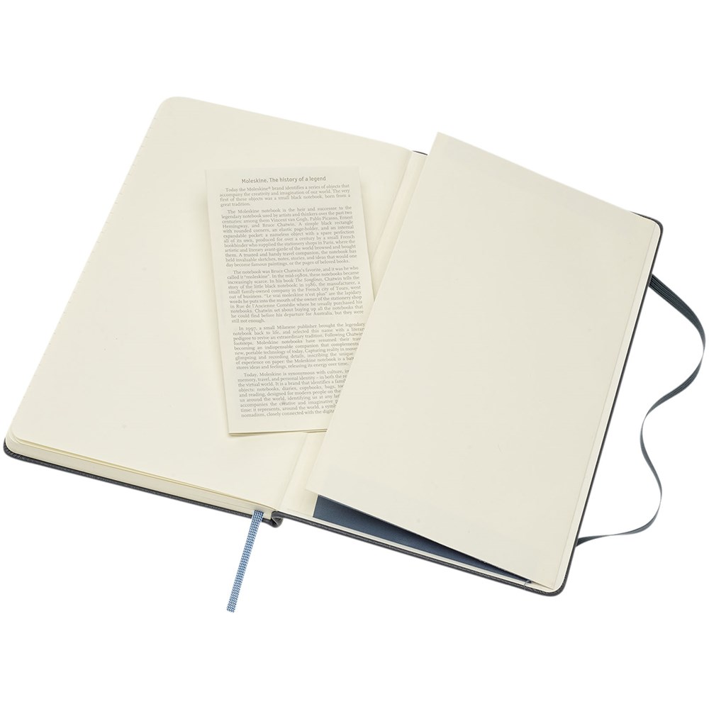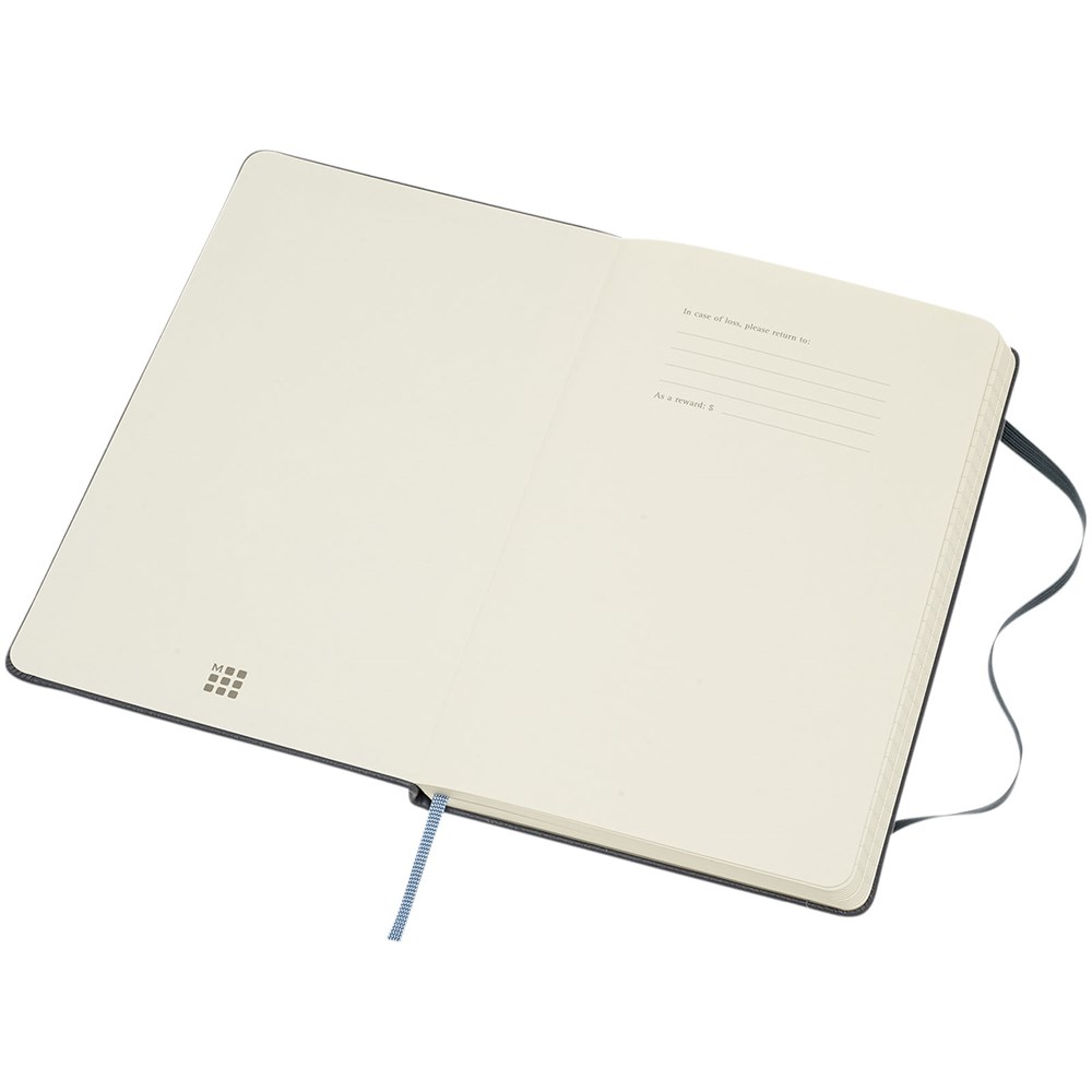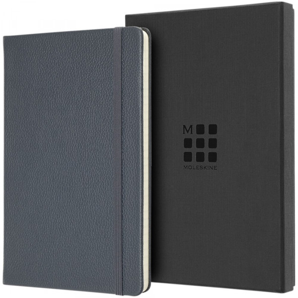 Premium-Ledernotizbuch in 4 Farben, in einer schwarzen Moleskine-Geschenkbox. Mit abgerundeten Ecken, elastischem Verschluss und Lesezeichenband. Mit elastischer Tasche auf der Rückseite und 176 Seiten liniertem elfenbeinfarbenem Papier (100 g/m²). Auf der ersten Seite finden Sie Platz für Ihre Kontaktdaten „bei Verlust“ und eine Belohnung oder eine Nachricht für den Finder.
