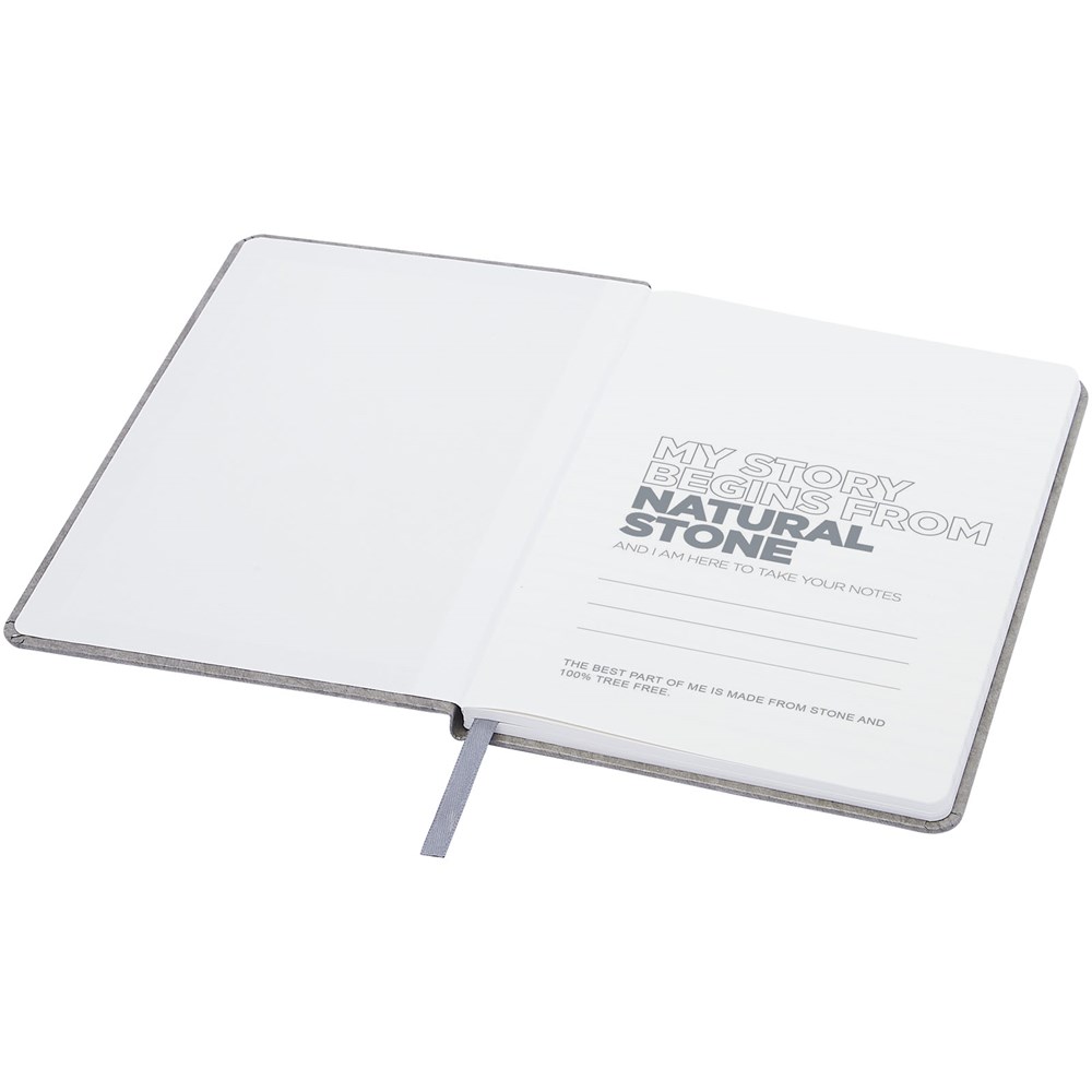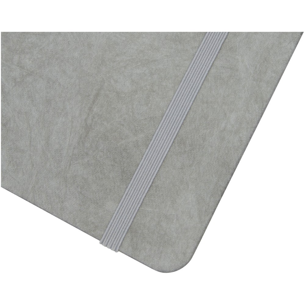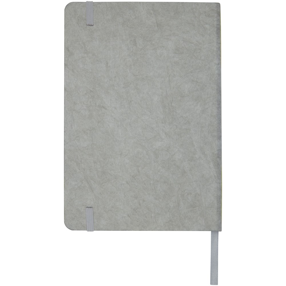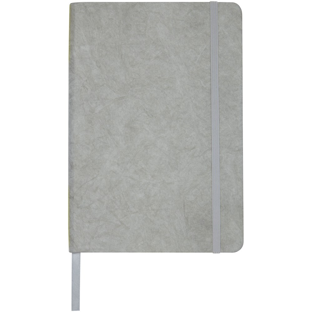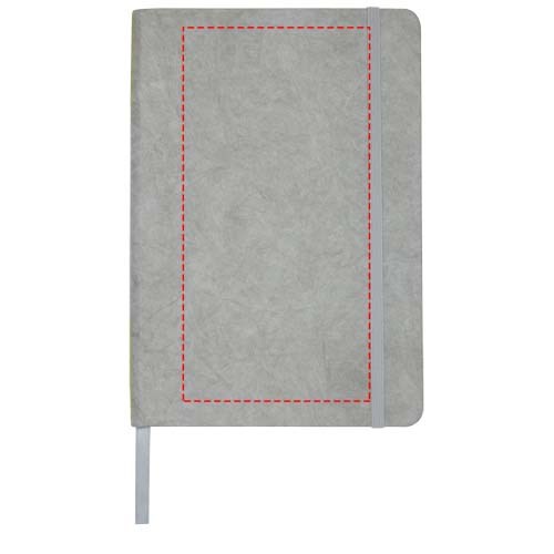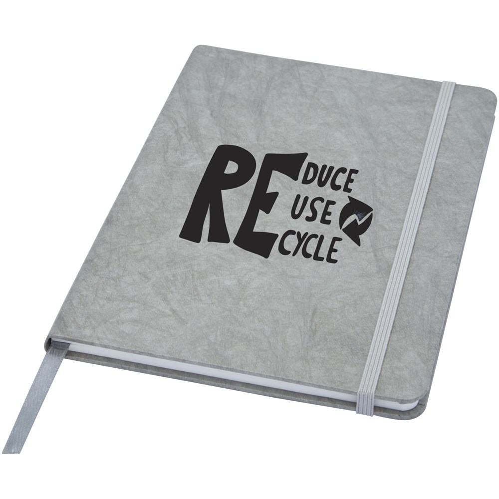 A5 reißfestes Notizbuch mit Inhaltsseiten aus Steinpapier. Steinpapier ist 100 % holzfrei und der Produktionsprozess verbraucht weniger Energie als recyceltes oder neues Zellstoffpapier. Es ist wasserbeständig, sodass verschüttete Flüssigkeiten leicht abgewischt werden können. Verfügt über ein farblich abgestimmtes Leseband und ein Elastikband sowie 60 Blatt, 120 g/m² linierte Inhaltsseiten aus Steinpapier. Verpackt in einer Kartonhülle.