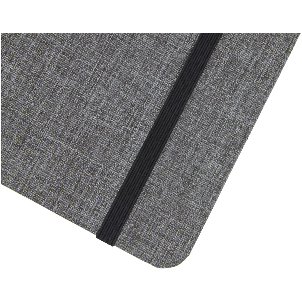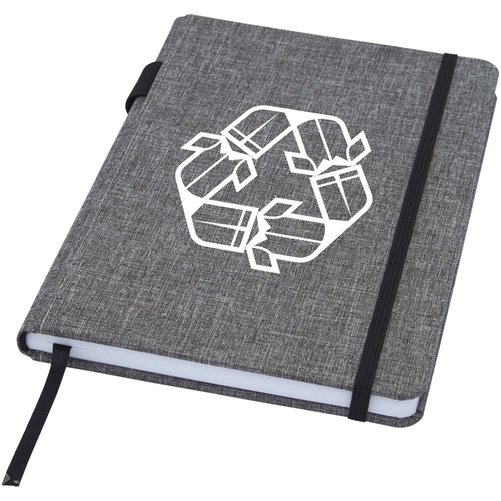 A5 Notizbuch mit einem Cover aus RPET-Stoff. Mit 96 Blatt, 70 g/m² recyceltes Papier mit liniertem Layout, Stiftschlaufe und Leseband. Verpackt in einer Kartonhülle.