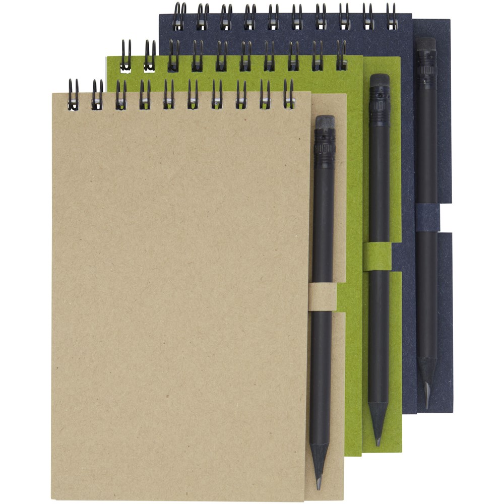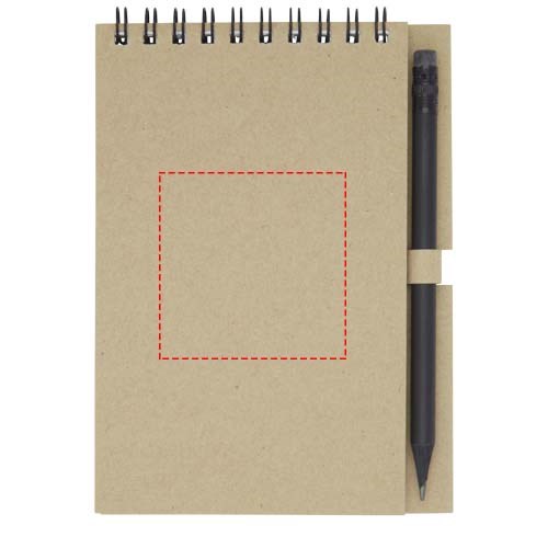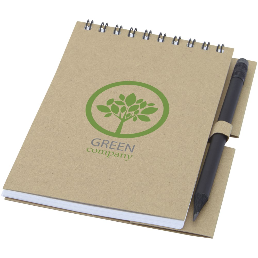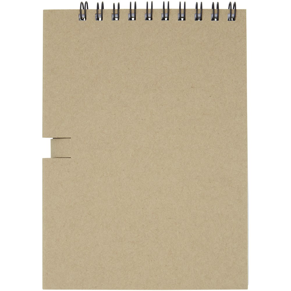 Spiralnotizbuch aus recyceltem Papier mit 40 Blatt, 80 g/m² blanko FSC recyceltes Papier und ein schwarzer Stift. Das Notebook wird in Italien hergestellt.