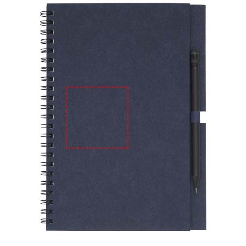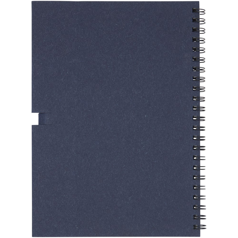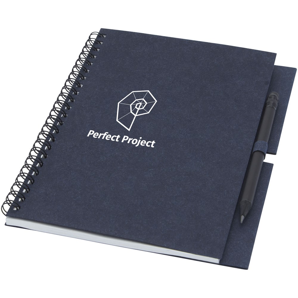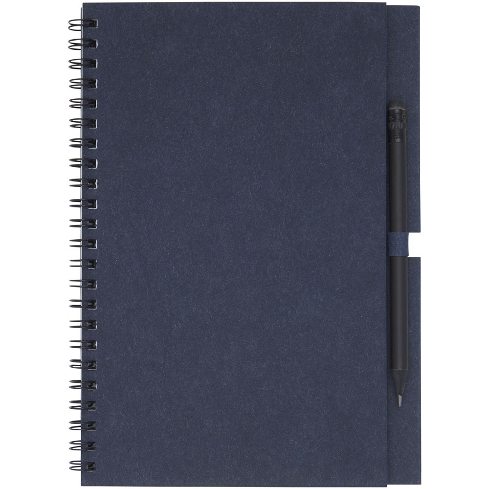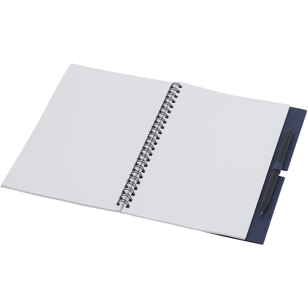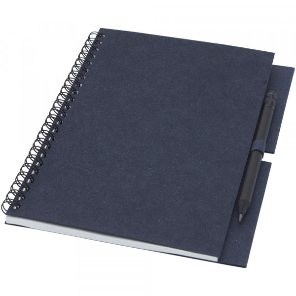Spiralnotizbuch aus recyceltem Papier mit 40 Blatt, 80 g/m² blanko FSC recyceltes Papier und ein schwarzer Stift. Das Notebook wird in Italien hergestellt.