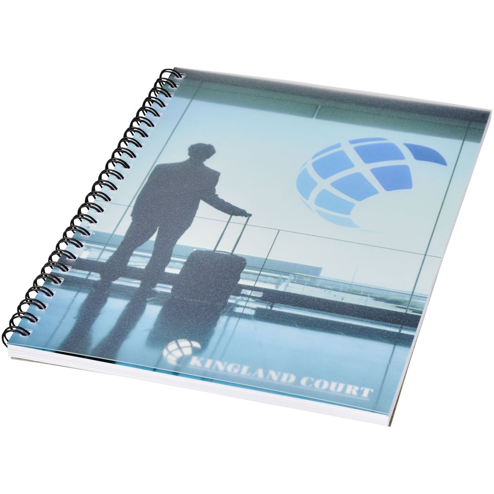 Desk-Mate® A5 Spiralnotizbuch.Standardlieferung mit 50 Blatt 80g/m2-Papier, einem glänzenden Karton-Deckblatt (250g/m2) und einem transparenten Polypropylenumschlag von 450 Mikron. Schwarze oder weiße Spiralbindung. Auch erhältlich mit 100 Blatt. Vollfarbdruck auf dem Deckblatt und jedem Einzelblatt möglich.