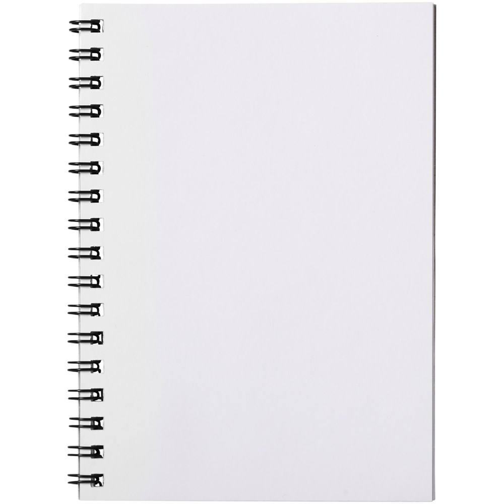 Desk-Mate® A6 Spiralnotizbuch. Enthält 50 Blatt 80g/m2-Blankopapier, ein glänzendes Karton-Deckblatt (250g/m2) und einen transparenten Polypropylenumschlag von 450 Mikron. Schwarze oder weiße Spiralbindung. Auch erhältlich mit 100 Blatt. Vollfarbdruck auf dem Deckblatt und jedem Einzelblatt möglich.