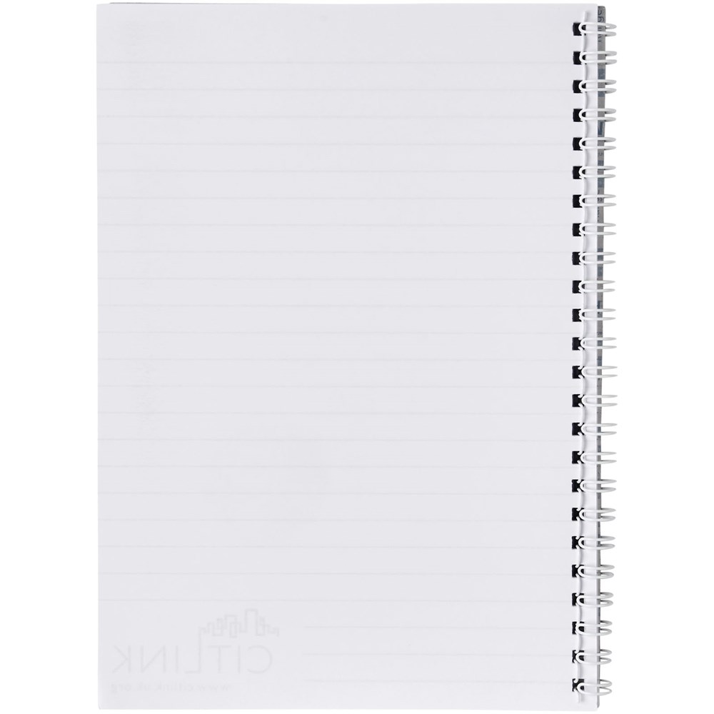 Desk-Mate® A5 Spiralnotizbuch. Dieses Notizbuch verfügt über eine weiße oder schwarze Spiralbindung, ein glänzendes Karton-Deckblatt (250g/m2) und 80g/m2-Blankopapier. Standardlieferung mit 50 Blatt, auch erhältlich mit 80 Blatt. Eine Dekoration ist auf dem Umschlag sowie jedem Blatt möglich.