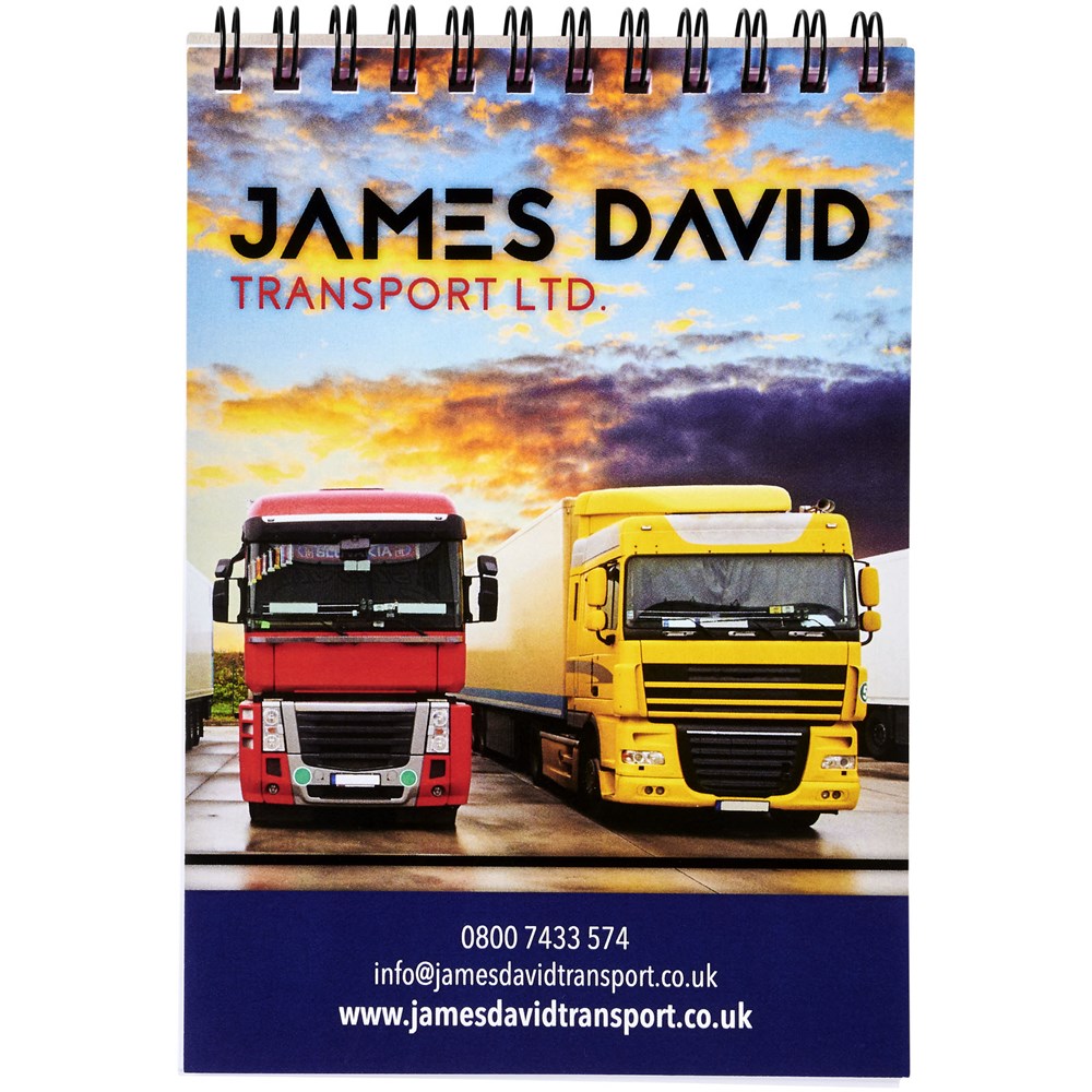 Desk-Mate® A6 Spiralnotizbuch. Dieses Notizbuch verfügt über eine weiße oder schwarze Spiralbindung, ein glänzendes Karton-Deckblatt (250g/m2) und 80g/m2-Blankopapier. Standardlieferung mit 50 Blatt, auch erhältlich mit 80 Blatt. Eine Dekoration ist auf dem Umschlag sowie jedem Blatt möglich.