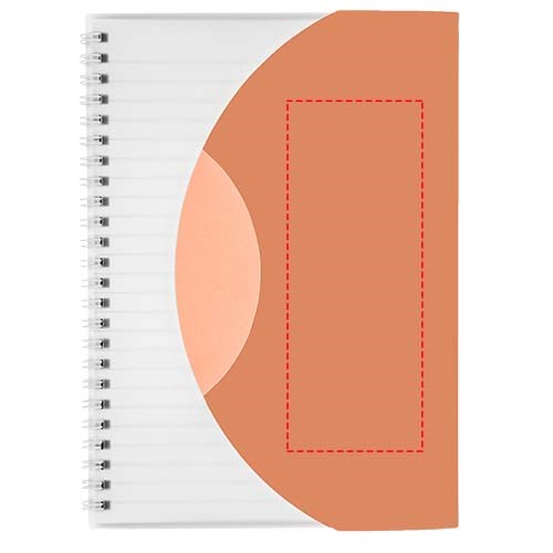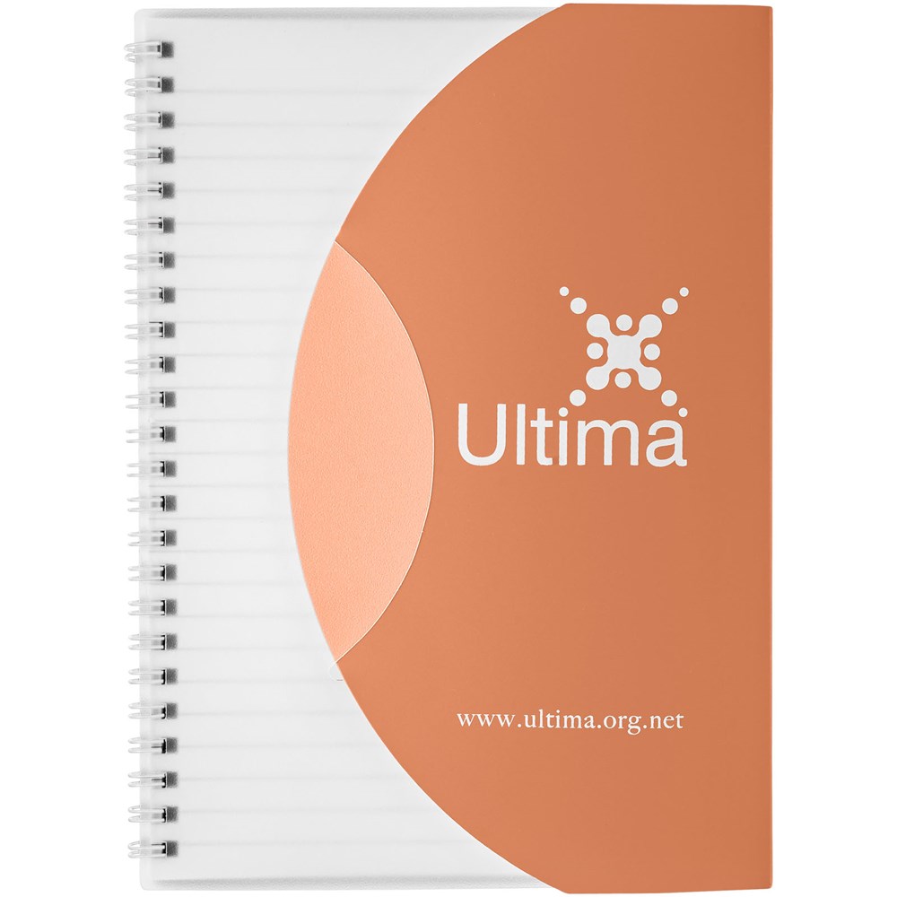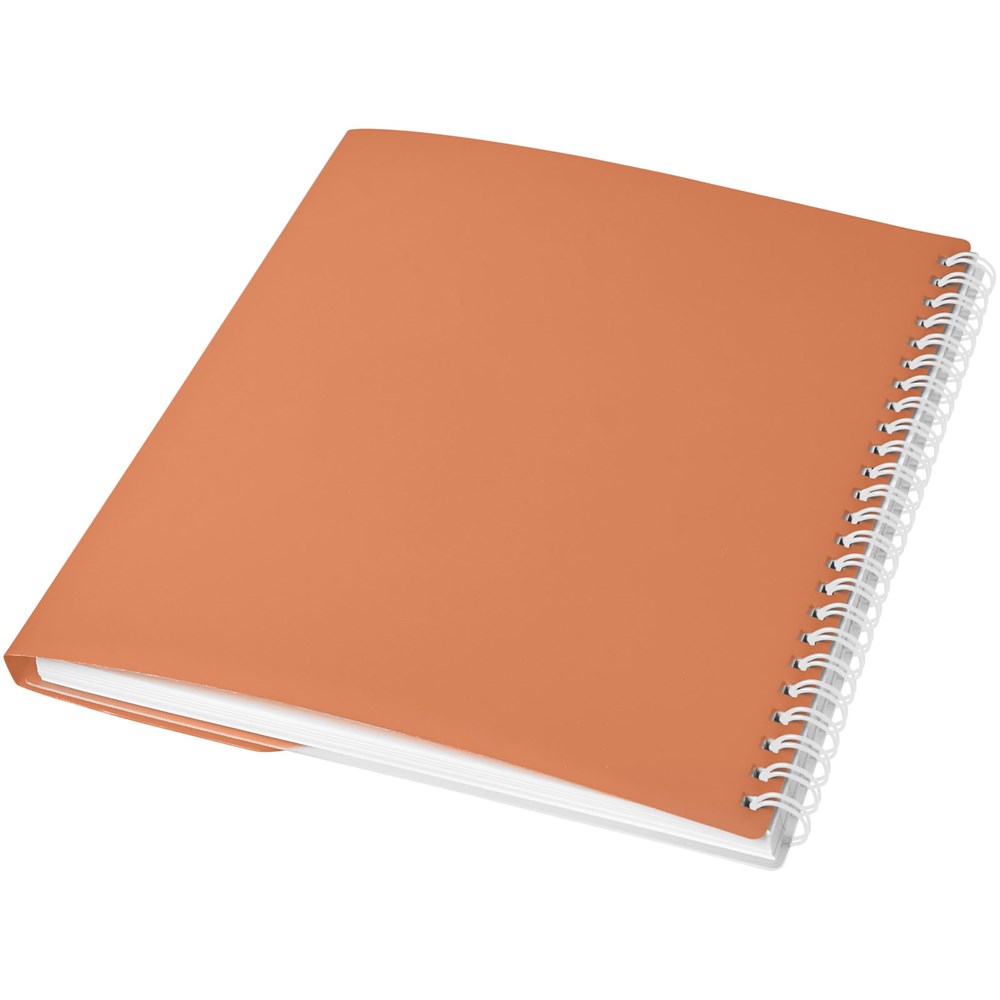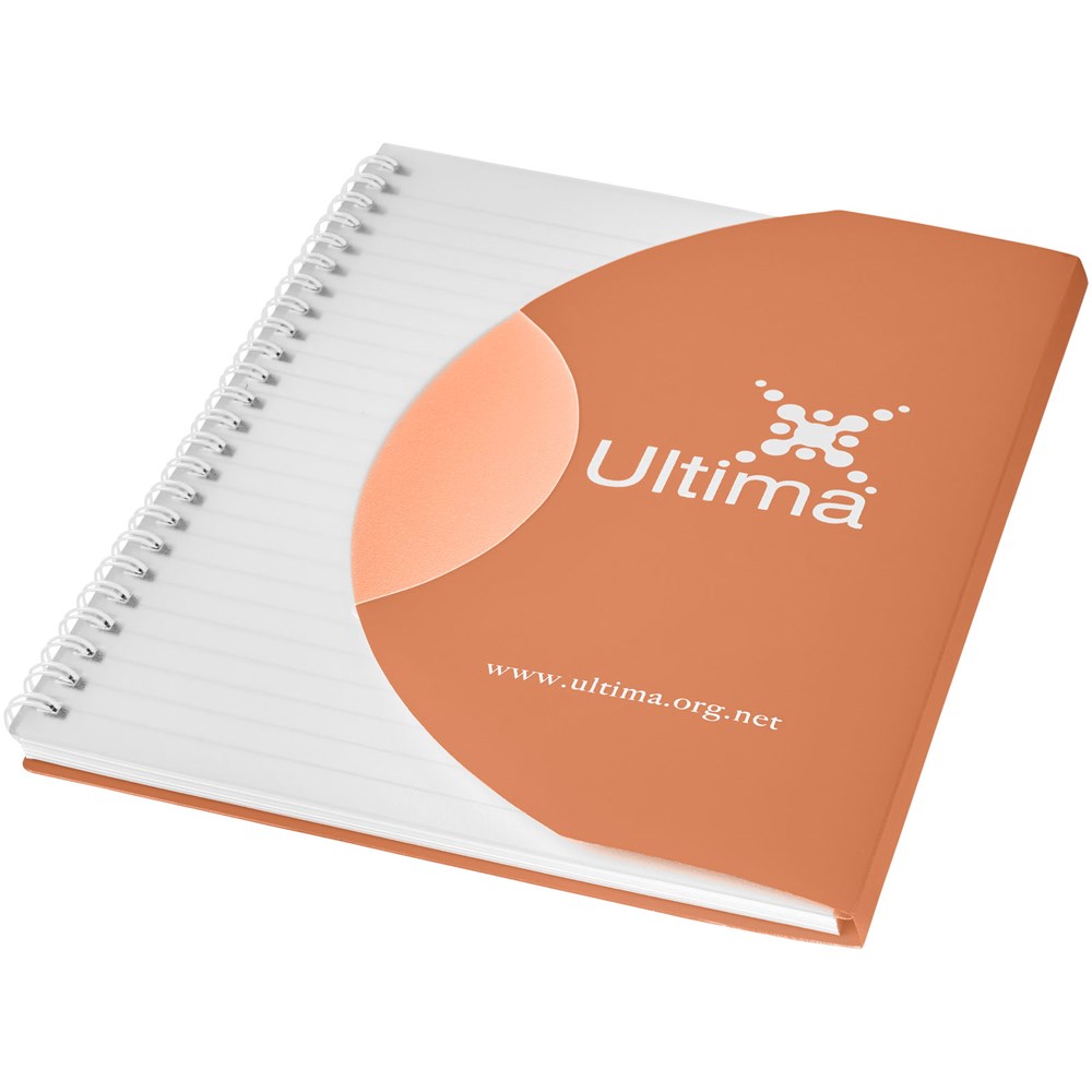 Curve A5 Spiralnotizbuch. Enthält 50 Blatt Blankopapier (80 g/m2) und einen farbigen Polypropylenumschlag von 500 Mikron. Die geschwungene Form verschließt das Notizbuch sicher. Eine Dekoration ist auf dem Umschlag sowie auf jedem Blatt möglich.