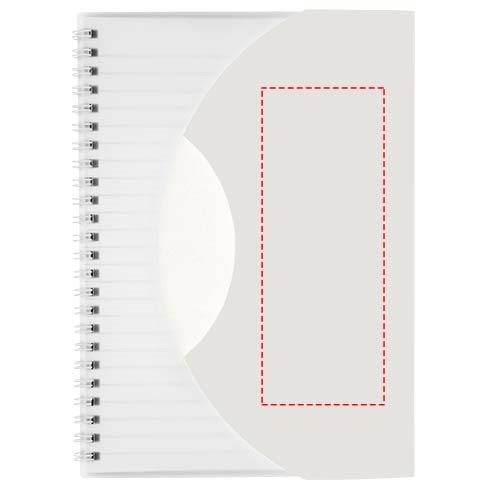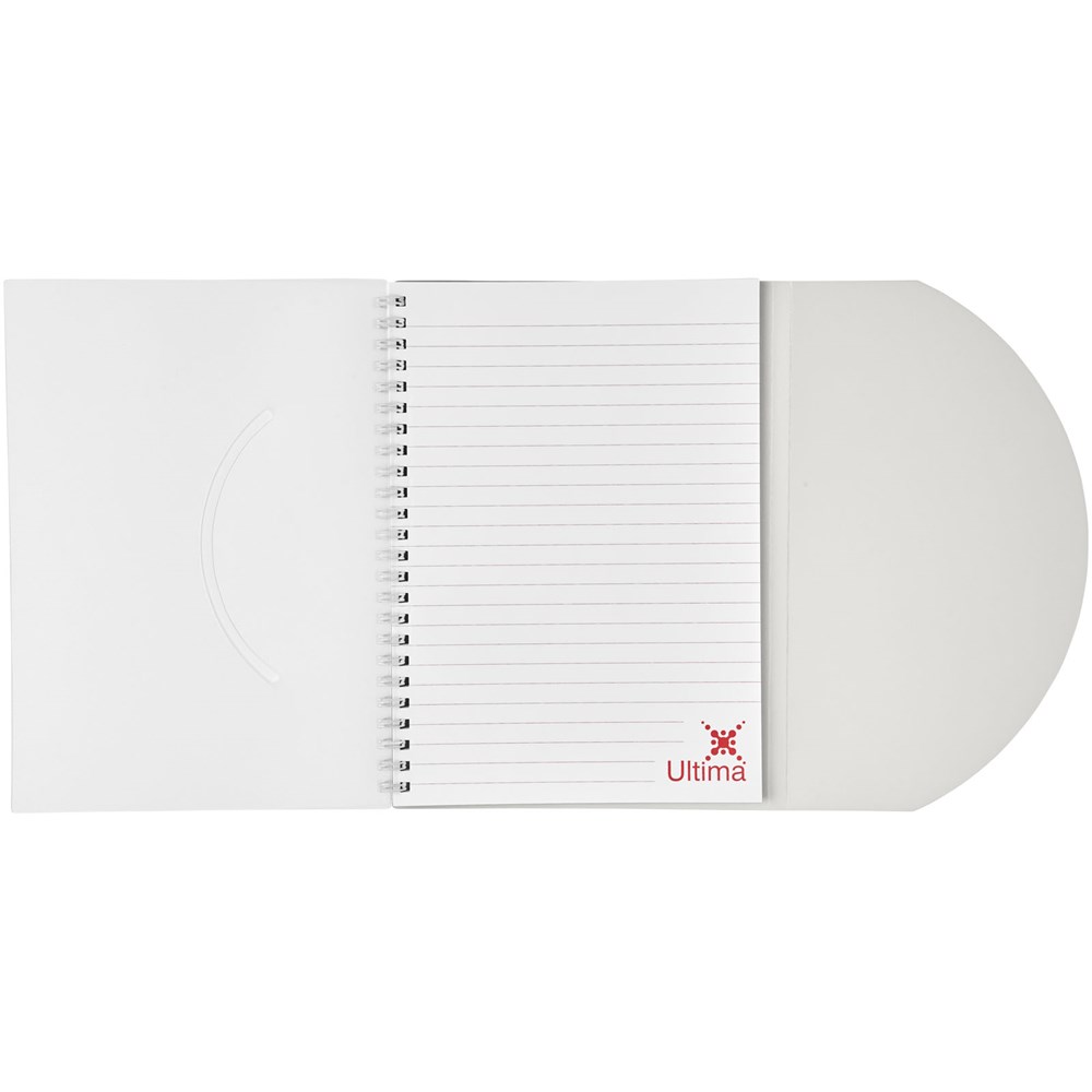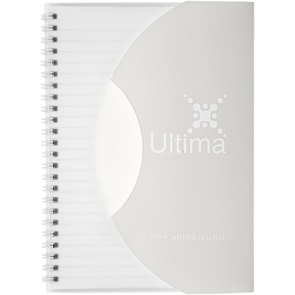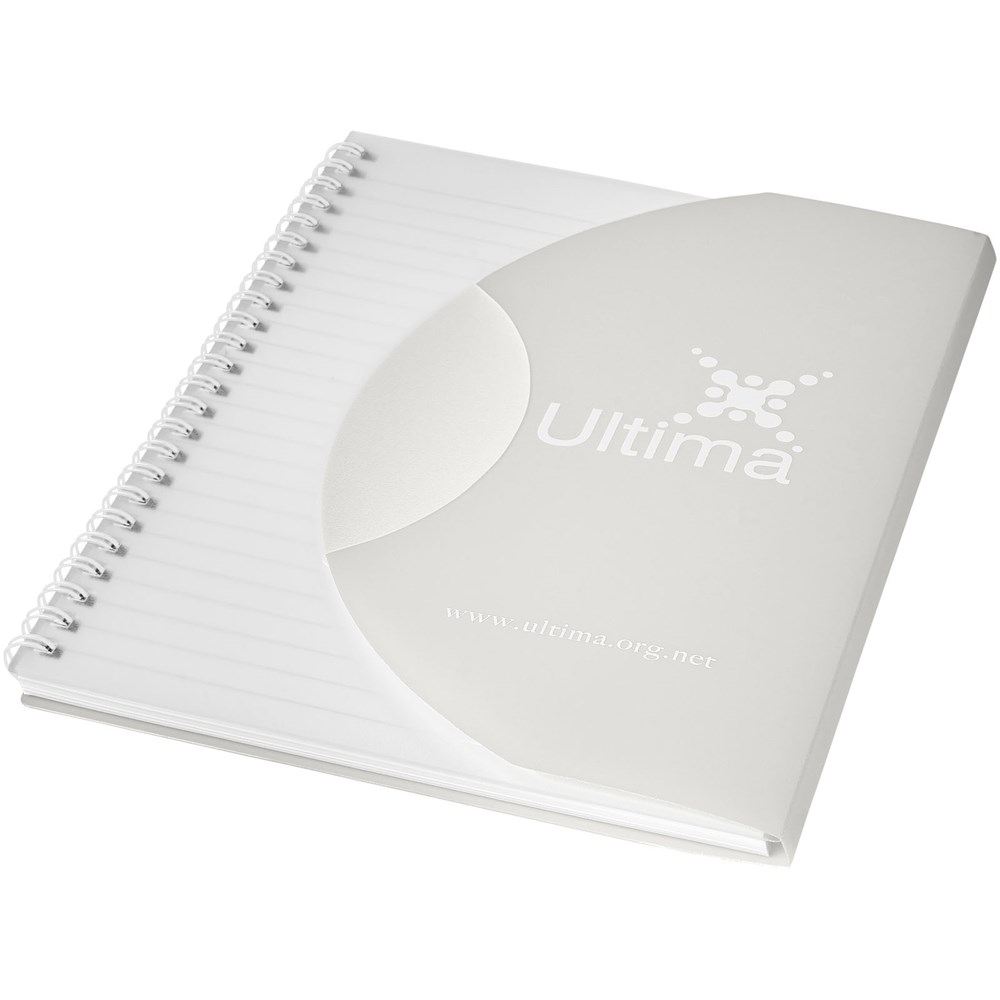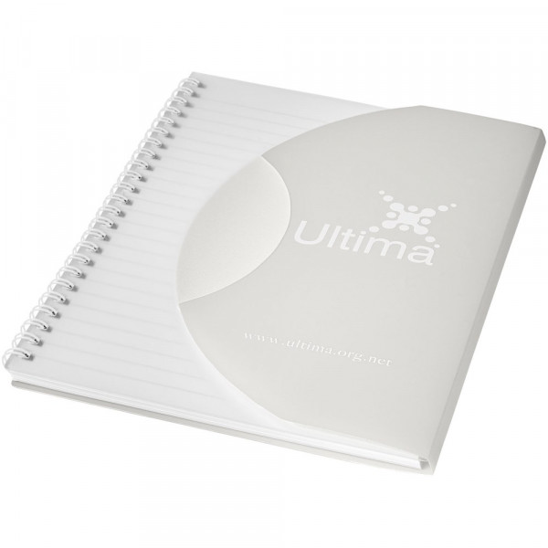 Curve A5 Spiralnotizbuch. Enthält 50 Blatt Blankopapier (80 g/m2) und einen farbigen Polypropylenumschlag von 500 Mikron. Die geschwungene Form verschließt das Notizbuch sicher. Eine Dekoration ist auf dem Umschlag sowie auf jedem Blatt möglich.