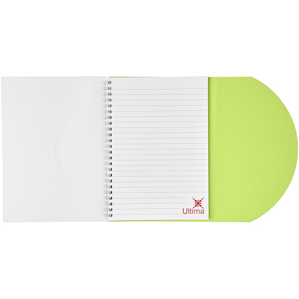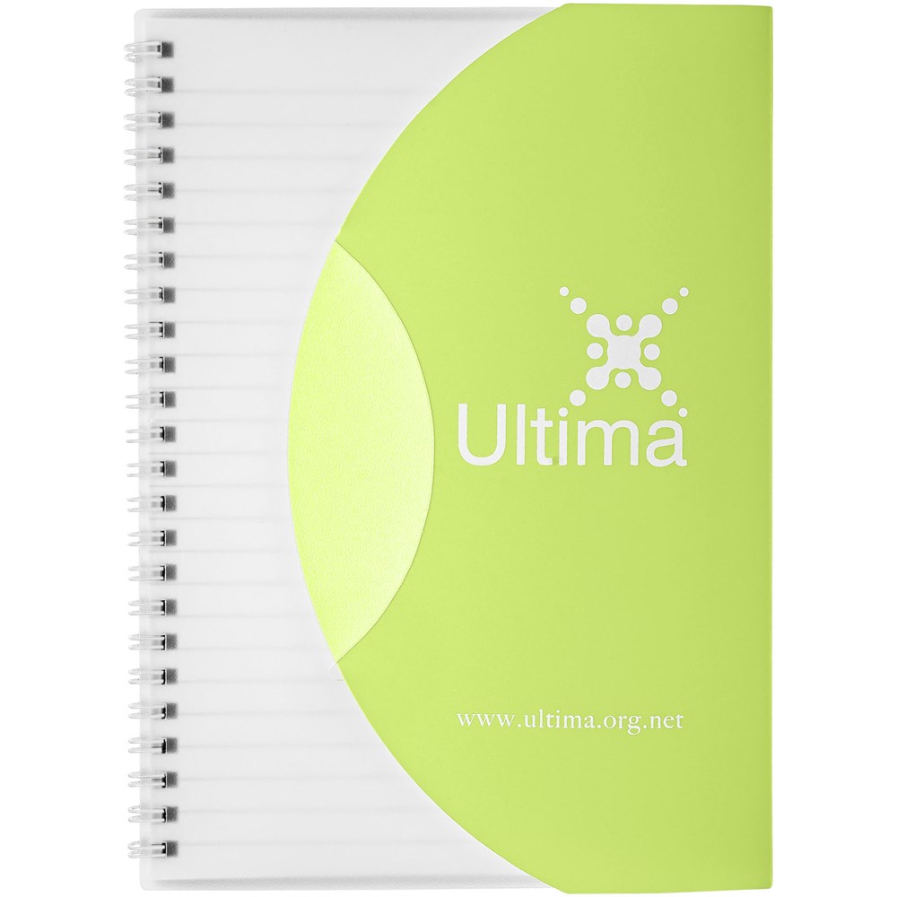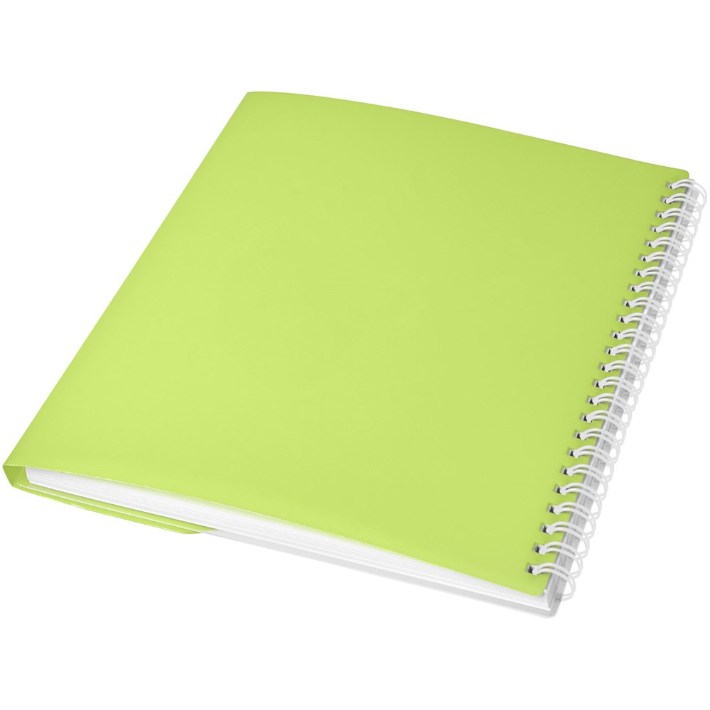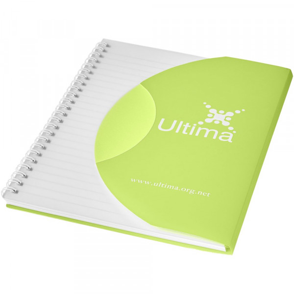 Curve A5 Spiralnotizbuch. Enthält 50 Blatt Blankopapier (80 g/m2) und einen farbigen Polypropylenumschlag von 500 Mikron. Die geschwungene Form verschließt das Notizbuch sicher. Eine Dekoration ist auf dem Umschlag sowie auf jedem Blatt möglich.