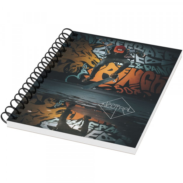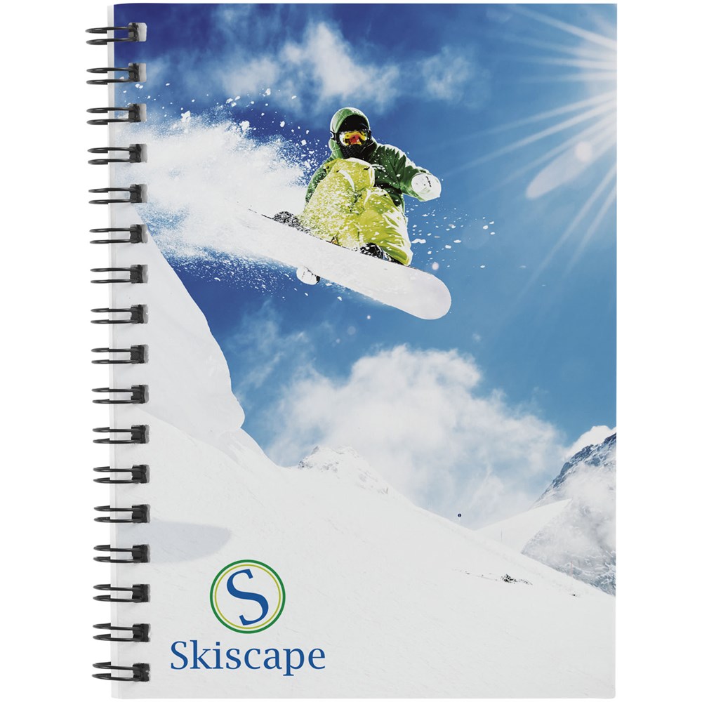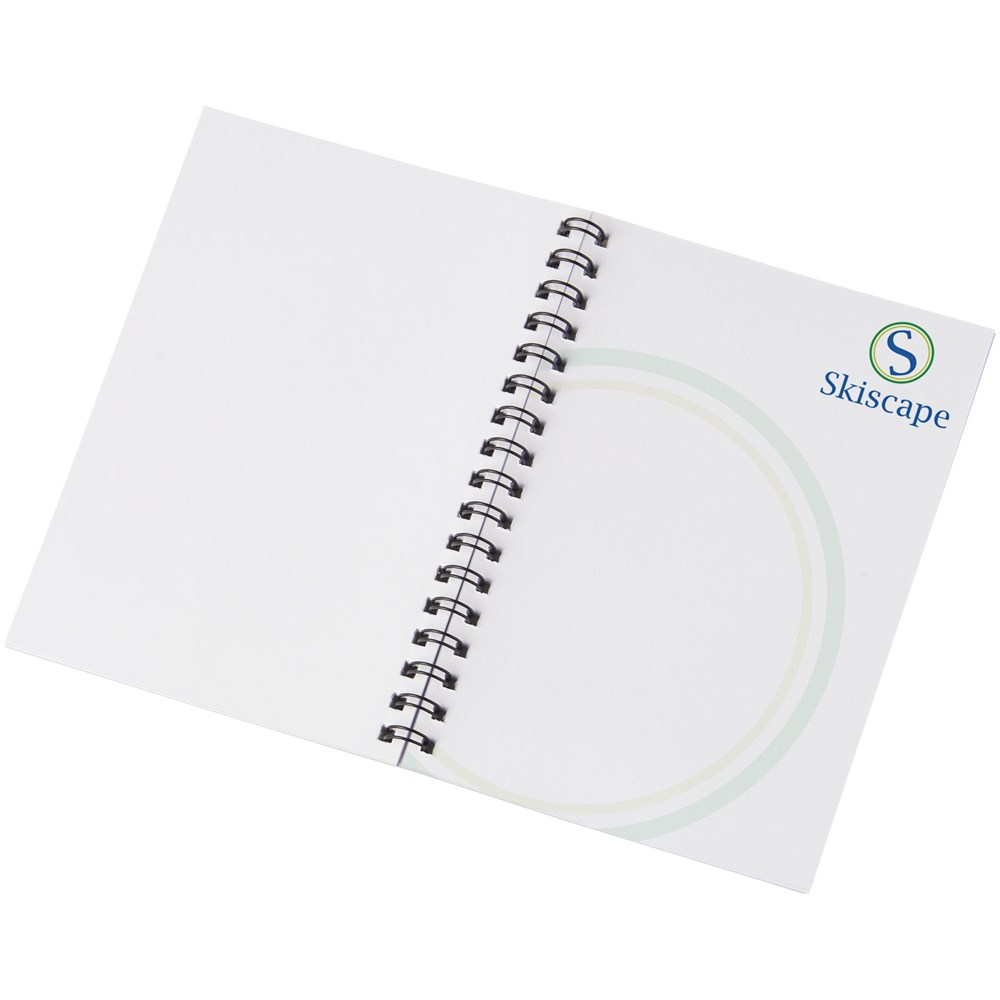 Desk-Mate® A6 Spiralnotizbuch. Enthält 50 Blatt Blankopapier (80 g/m2) und einen Umschlag (450 g/m2). Der Umschlag ist reiß- und wasserfest. Schwarze oder weiße Spiralbindung. Vollfarbdruck auf dem Umschlag und auf jedem Blatt möglich.