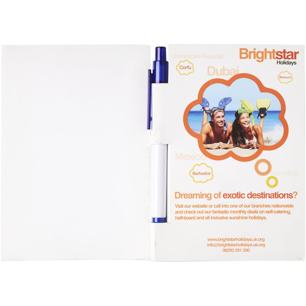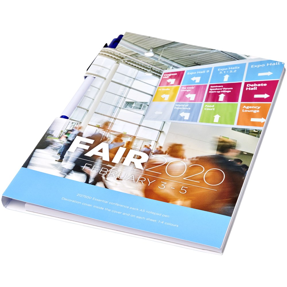 Essential Conference Pack A5. Enthält ein A5-Notizbuch mit 50 Blatt Blankopapier (80 g/m2) sowie einen Calypso-Stift am Buchrücken. Das Conference Pack ist mit einem Softcover (350 g/m2) ausgestattet. Vollfarbdruck auf beiden Seiten des Umschlags sowie auf jedem Blatt möglich.