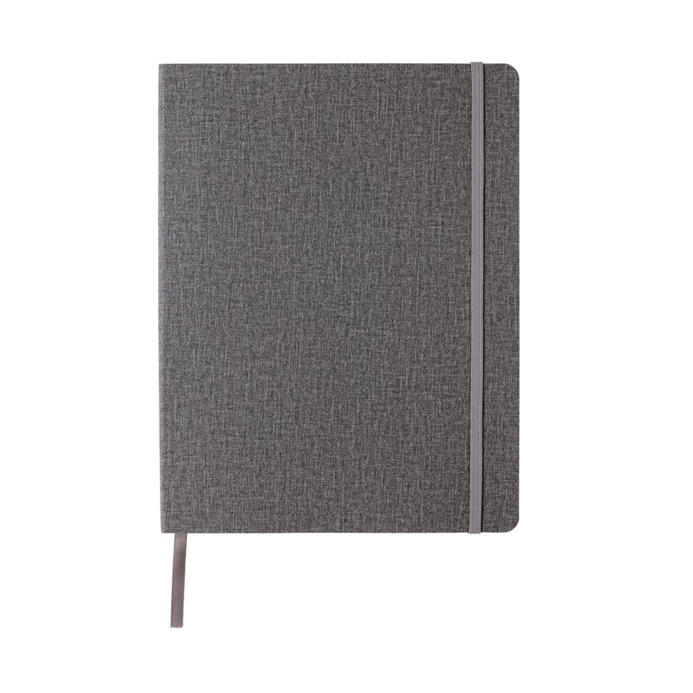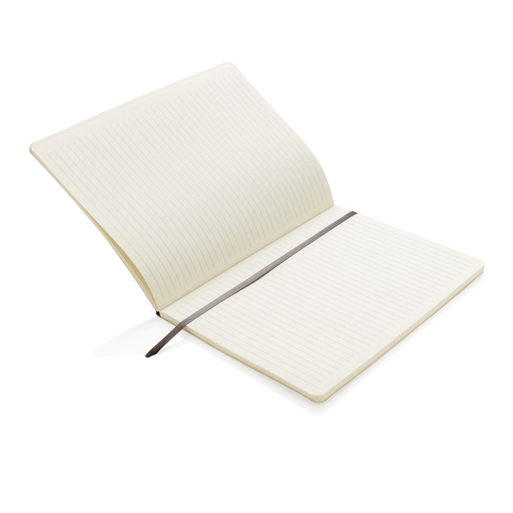 Flexibles Softcover Notizbuch im B5 Format, 19x25cm. Mit elastischem Verschlußband, Seitentrenner und rückseitiger Tasche. 160 cremefarbene, linierte Seiten, 78g/qm