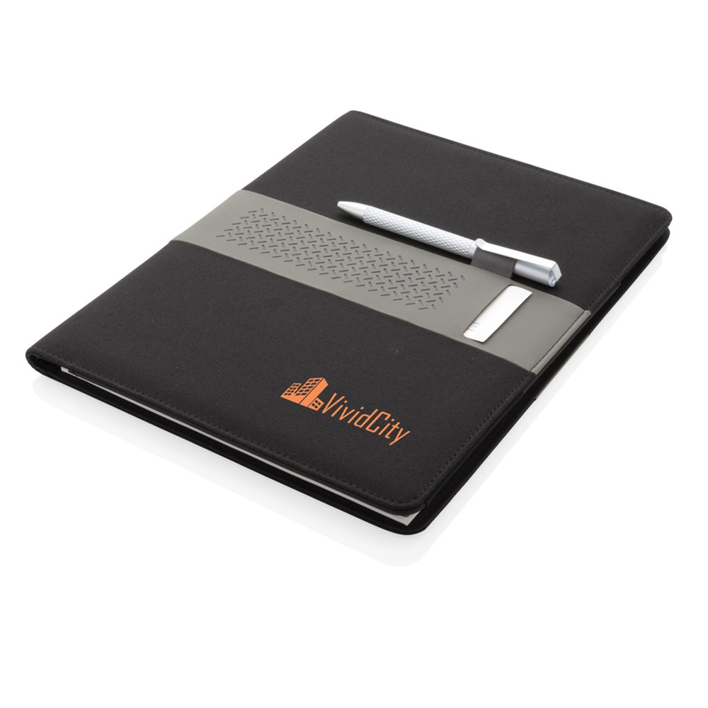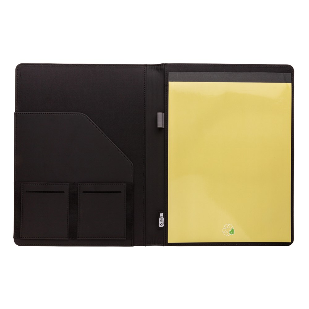 Dieses Portfolio bietet neben dem Notizblock mit 20 A4 Blättern, 70gr/m² weißes recyceltes Papier, auch noch Fächer für Visitenkarten oder Notizen sowie 2 Stiftschlaufen.