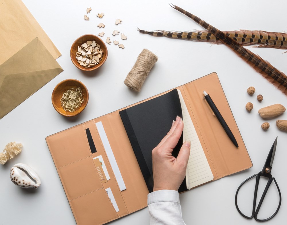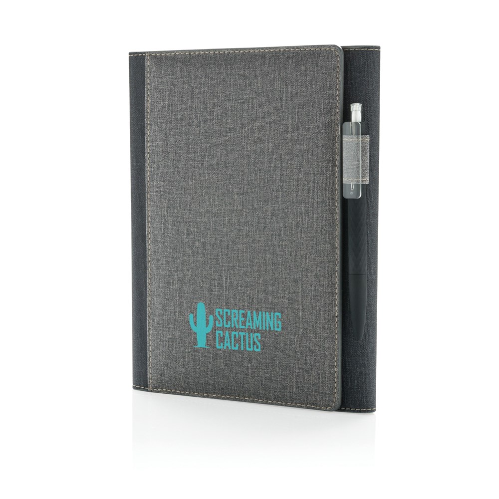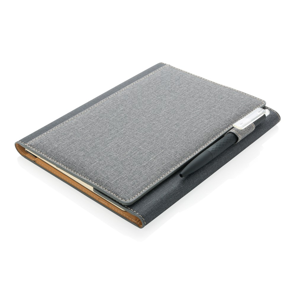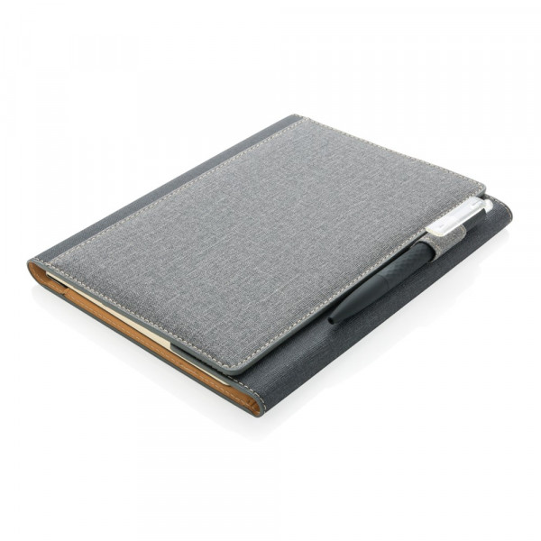 A5 Cover mit Magnetverschluß und Stifthalter sowie 3 Kartenfächern und einer weiteren größeren Tasche. Das Notizbuch mit 128 cremefarbenen, linierten Seiten 80g/m².